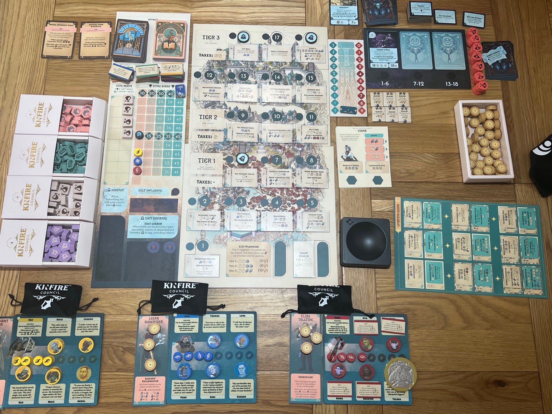 Published by Incredible Dream Studios and set in the city of Din’Lux, Kinfire Council is the third major release in the Kinfire universe, following Kinfire Chronicles and Kinfire Delve. Unlike its predecessors, which leaned into narrative storytelling and dungeon-crawling respectively, Kinfire Council is a competitive euro-style game with a political twist. Players take on the role of Seekers — agents of the council — tasked with managing the city, influencing decrees, and keeping cultist threats at bay.