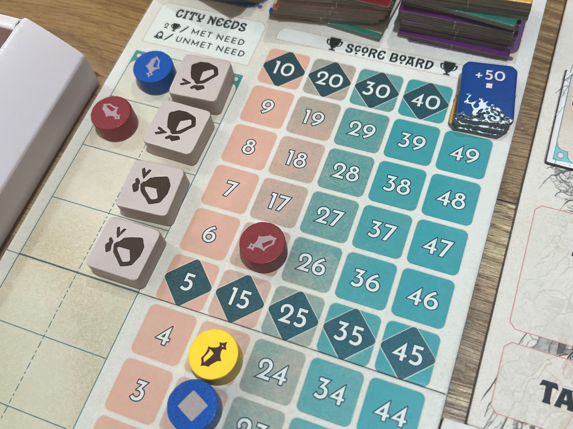 The base game itself is well produced anyway if I am being fair. The cardboard is thick, the artwork is vibrant, and the trays used to build the city are both practical and thematic. Setup is a bit involved — there are a lot of components — but the game includes a storage guide, and once everything is laid out, the table presence is impressive. Incredible Dream Studios has clearly invested in presentation, and it pays off. If I had one complaint here, it’s that the deluxe upgrades can’t really be accommodated in the base game box, and I don’t know about you, but I’ve never been a fan of having a separate box just for resources.