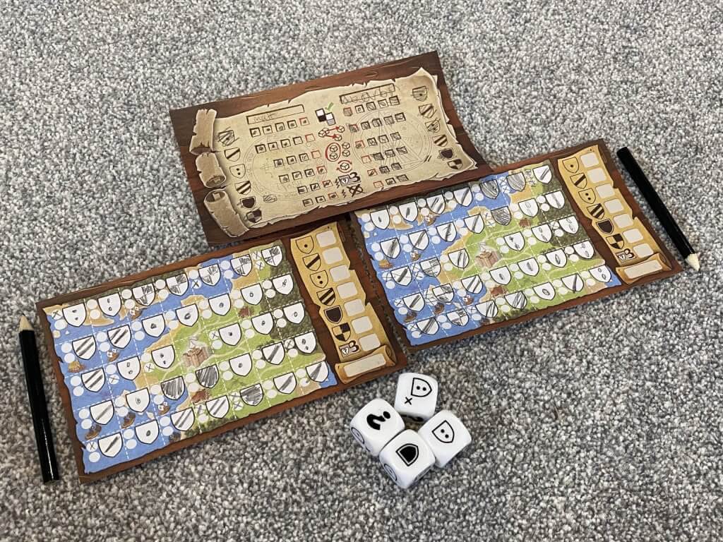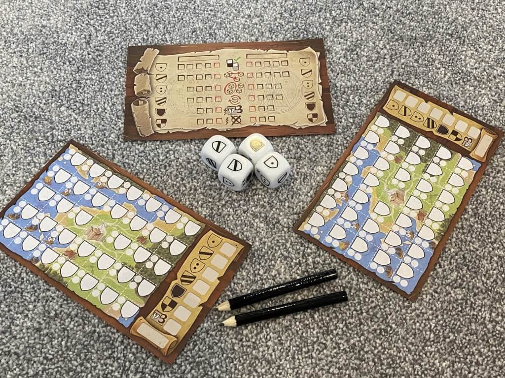 Before actually doing any rolling, the players will each tear off a sheet from the pad (and my first complaint is that for a two-player game, there really should have been two wipe-clean boards) to form their kingdom. They’ll also tear a third sheet off and flip it over (or use an old sheet) to mark each player’s progress against a number of sub-objectives that I’ll explain later.
