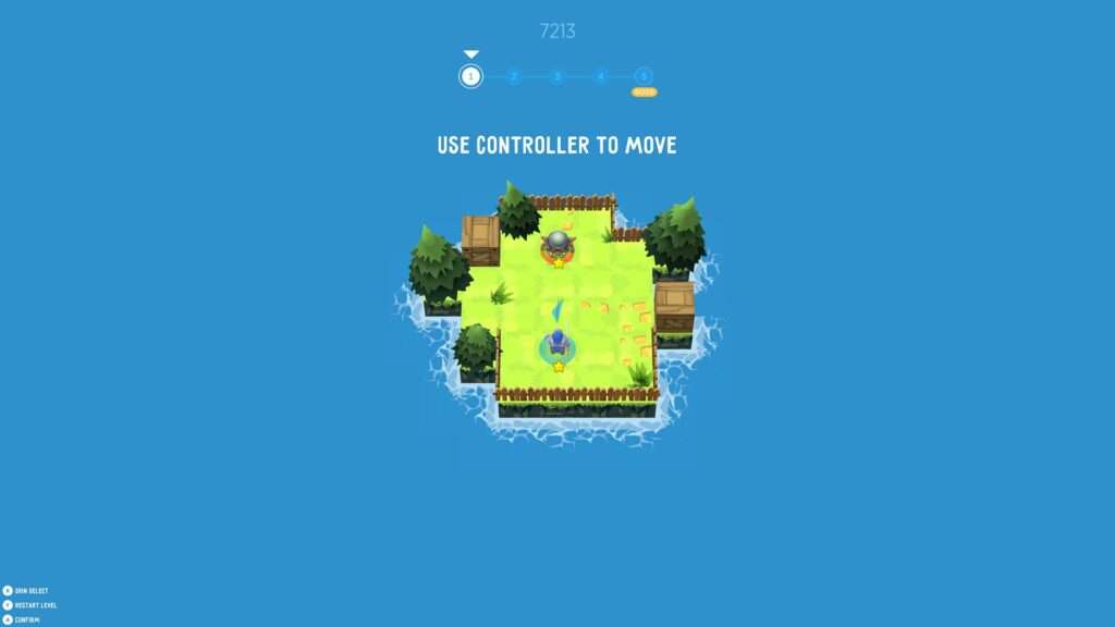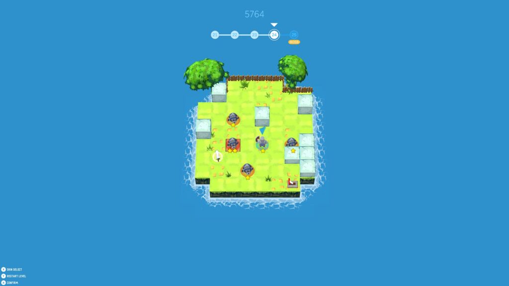 Whilst the art style itself is suitably cutesy and charming, there is a distinct lack of care with how Knight with Tactics is presented. When you fail, a sad face appears on the screen, but this sad face is almost the same colour as most of the level, so you can only see it due to the fact it swells and changes opacity. There is no pause menu or title screen, instead your three options (skins, restart, confirm) are written in miniscule font in the bottom left corner of the screen. Textures clip in and out in later levels, and the only audio I’ve encountered is a vaguely satisfying jingle that plays when you clear a level.