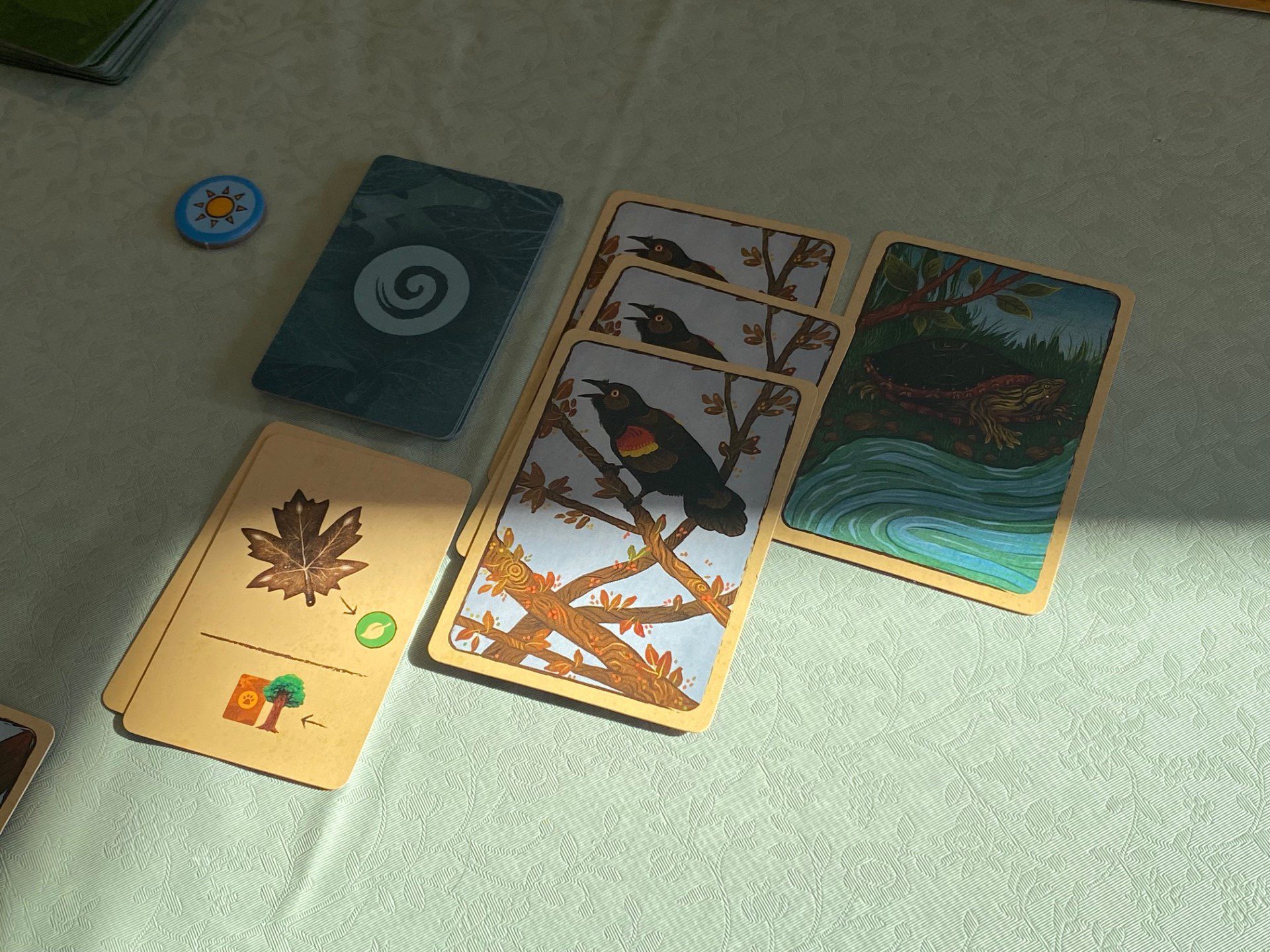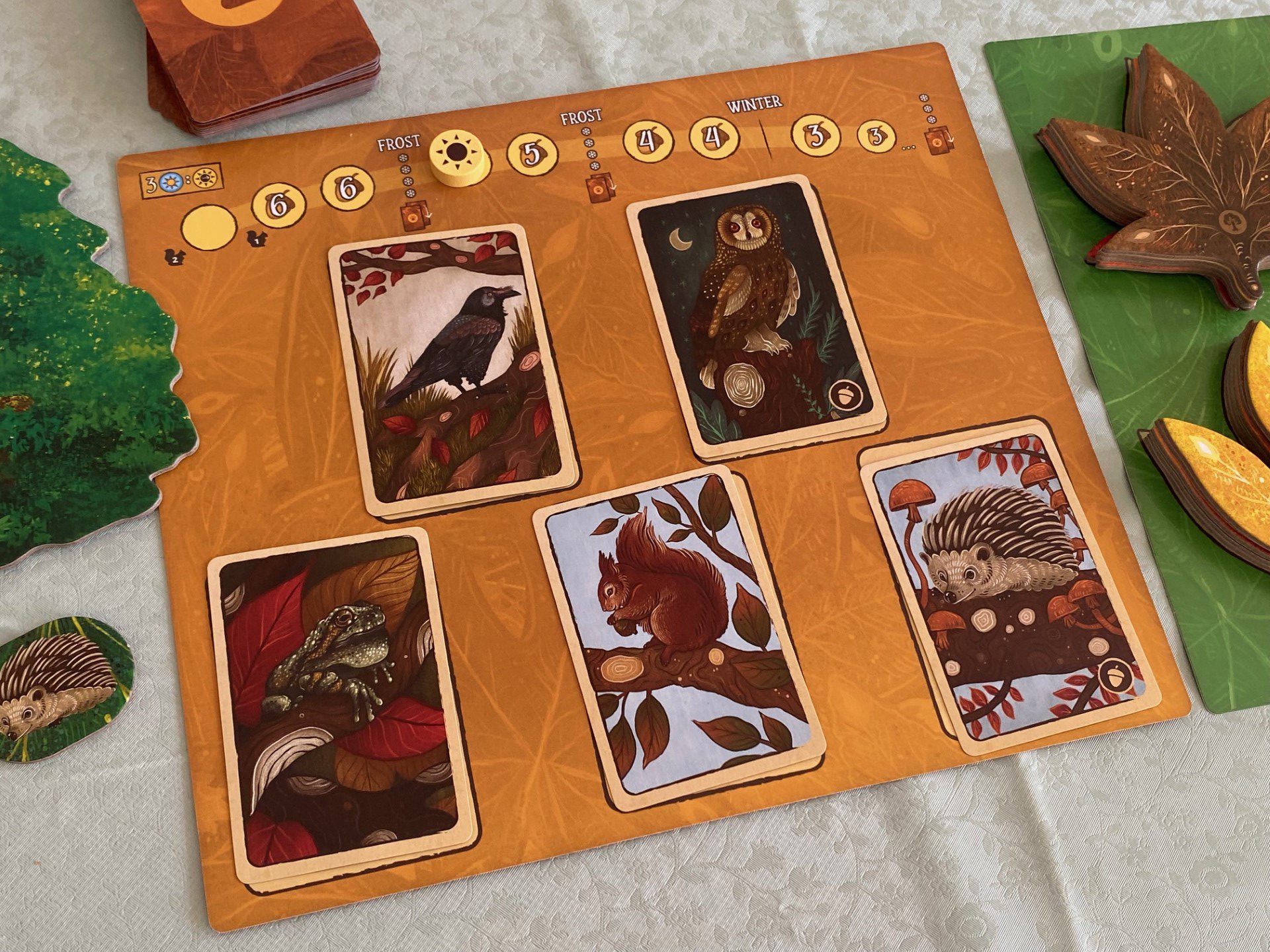 Next, let’s cover the animal cards. These cards are presented in a face-up “market” for players to choose from, and will simply be collected and placed above your player board when taken. Animals score no matter how many you have, but like mushrooms, the more you have, the better. Only animals which have hibernated will score though, and this is linked to the changing of the seasons.