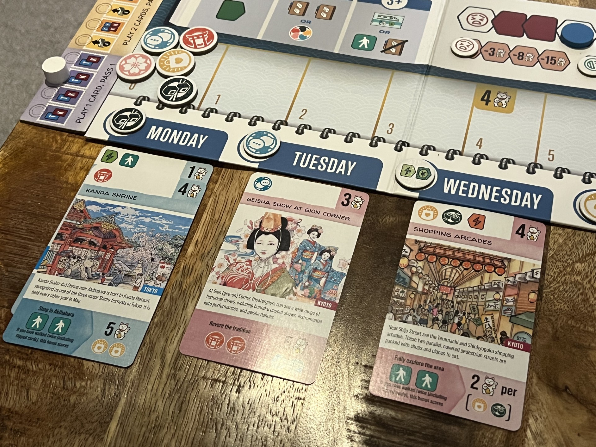 Essentially a card drafting and placement game, Lets Go! To Japan builds its theme around planning the best possible weeklong trip to Japan. Two decks of cards represent Tokyo and Kyoto, and each day will be randomly dealt a token to show what the “favourable condition” is. Every card has tokens that match those conditions, and so as you draft cards and decide which to keep (or pass) you’ll be looking for cards that match those symbols, and often trying to play them on days where they work best.