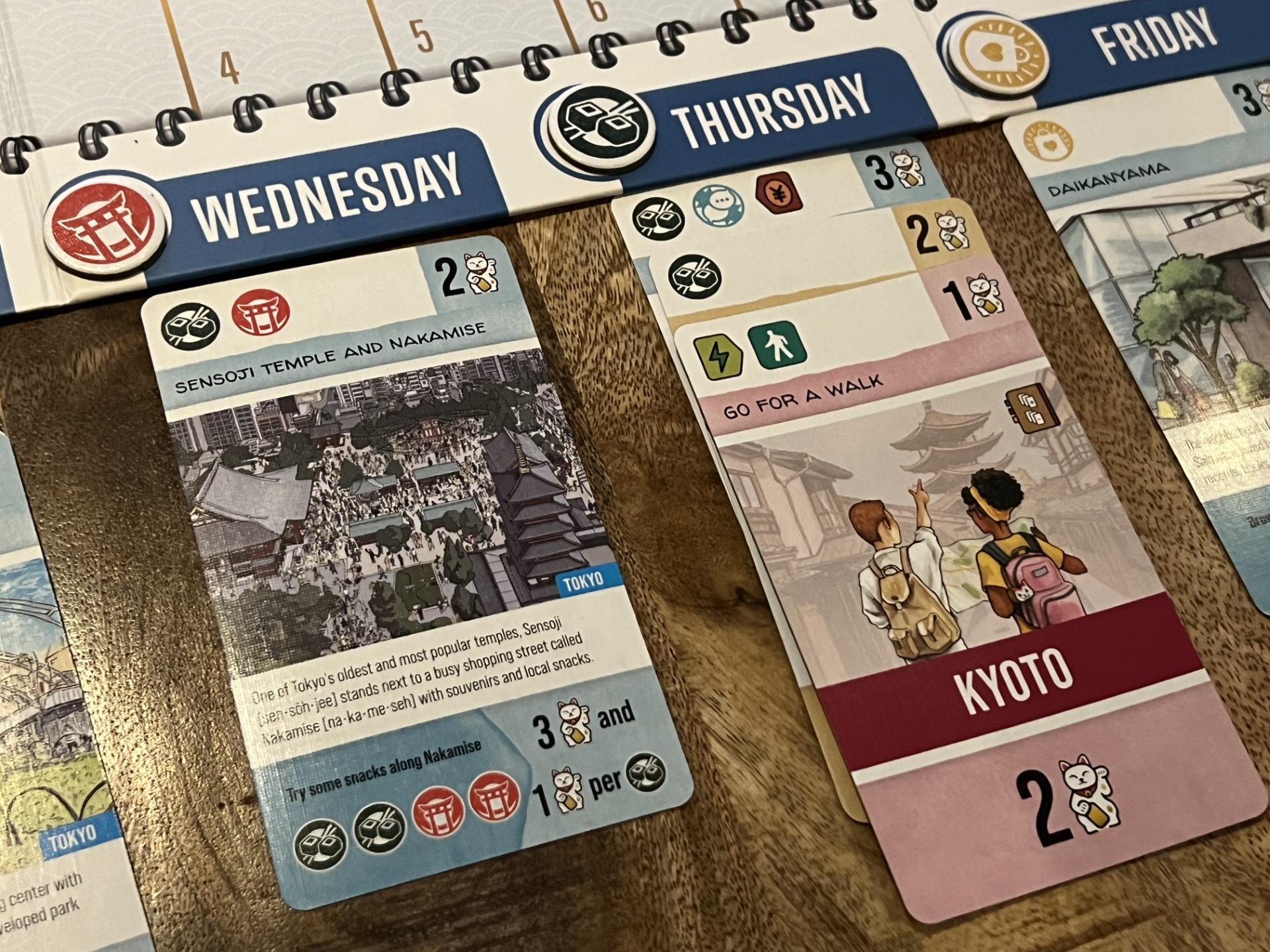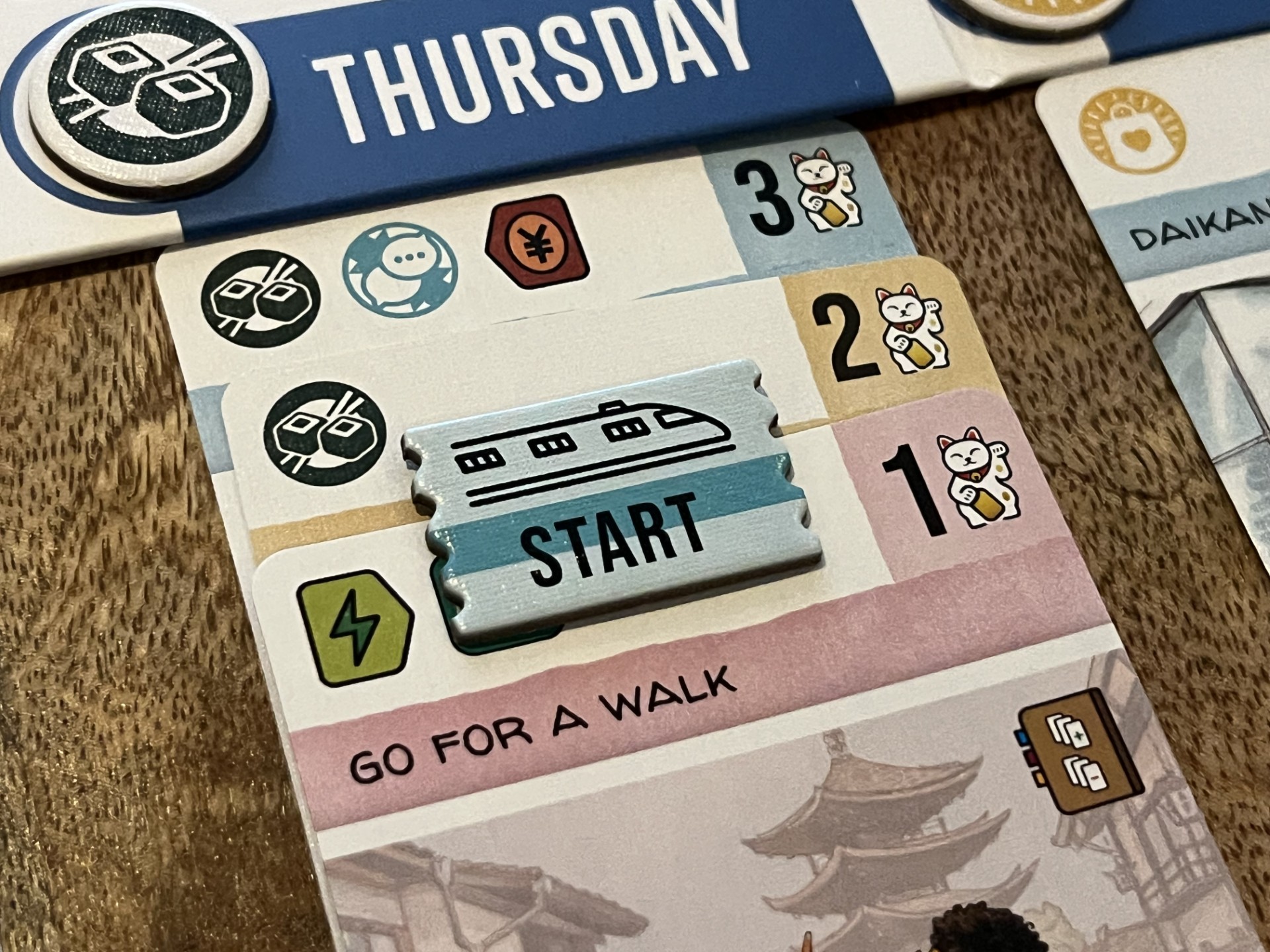 There are a few other features in Lets Go! To Japan that elevates it slightly from being a completely lightweight and somewhat luck-driven experience, to one that is actually more nuanced than you might initially think. For example, matching card icons with the favourable conditions of the day will grant the player bonus walk, research or luxury train tokens, which can be quite important throughout your planning.