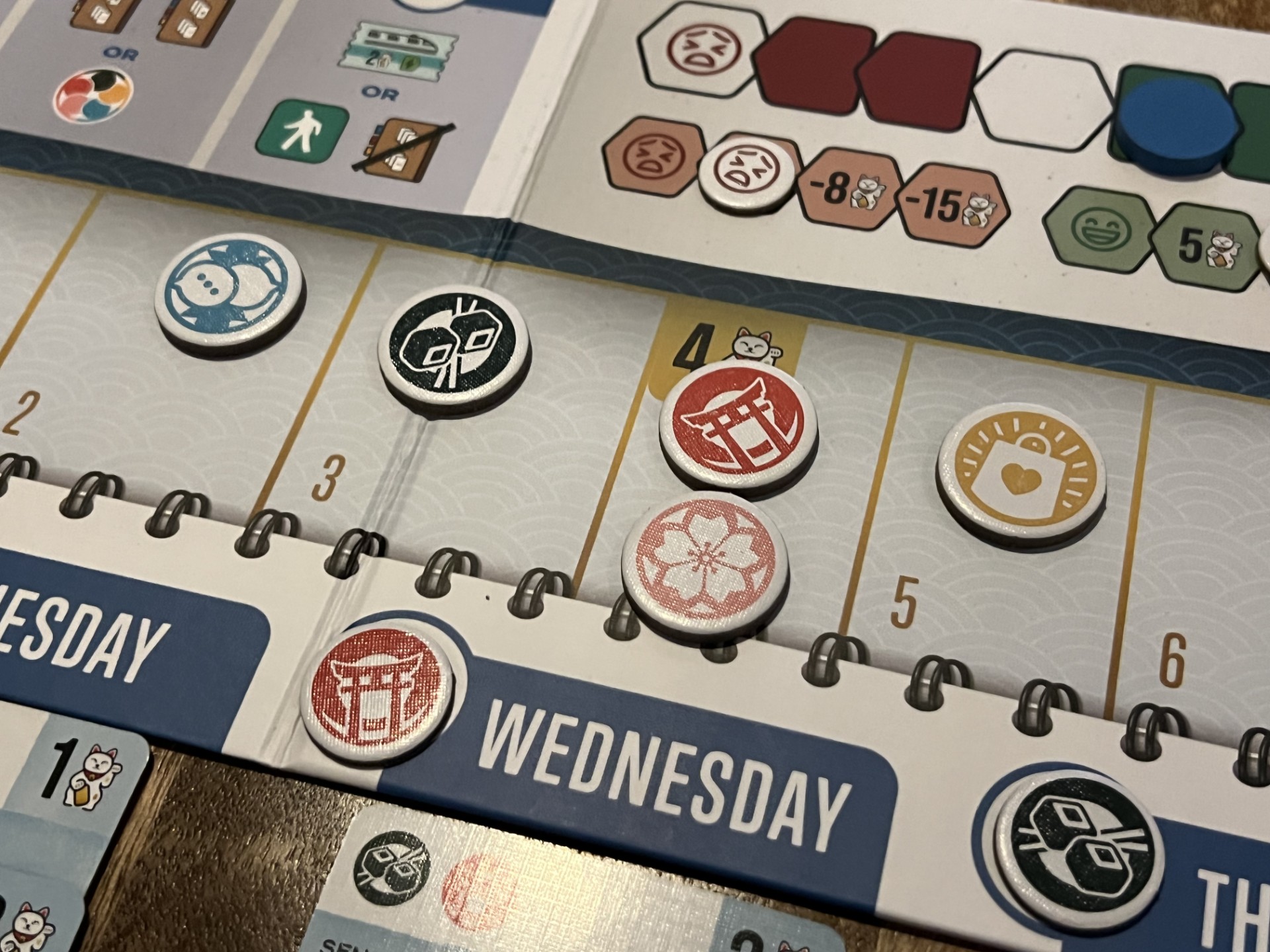 This scoring is a double-edged sword really, as I’ve found that younger players struggle to keep their overall level of success in mind, and tend to focus on the benefits and bonuses for each day specifically, often forgetting to consider multiple train journeys or forgetting that symbols that add up to daily highlights must accrue earlier in the week (including the day in question) when making their decisions.