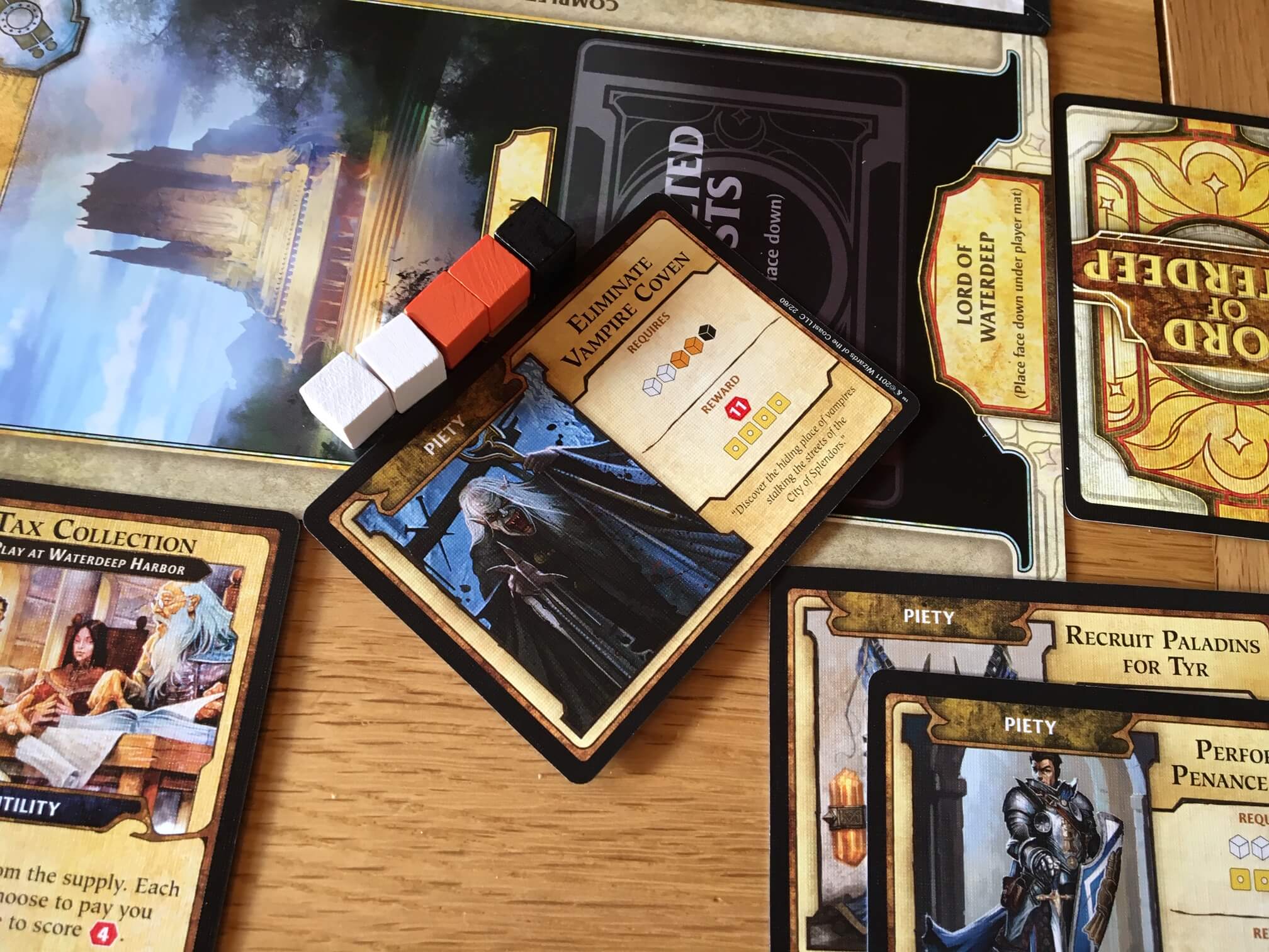 At around ninety minutes playtime and with lots of potential for variation, Lords of Waterdeep rarely outstayed its welcome. Each round begins with a smorgasbord of ideas that the player can consider — all of which will relate to working their way to the highest scoring quest either in their hand or on the board. Determining the order and importance of those actions is the whole game. Obtaining a quest card can be done in several ways, but taking two fighters and two rogues (plus one corruption) is unique and often highly prioritised. I’ve had turns in Lords of Waterdeep (sometimes final turns) where I chose boldly to skill up for a quest that I didn’t even have, then took it to claim the win. In other games, I was thwarted at the last moment.