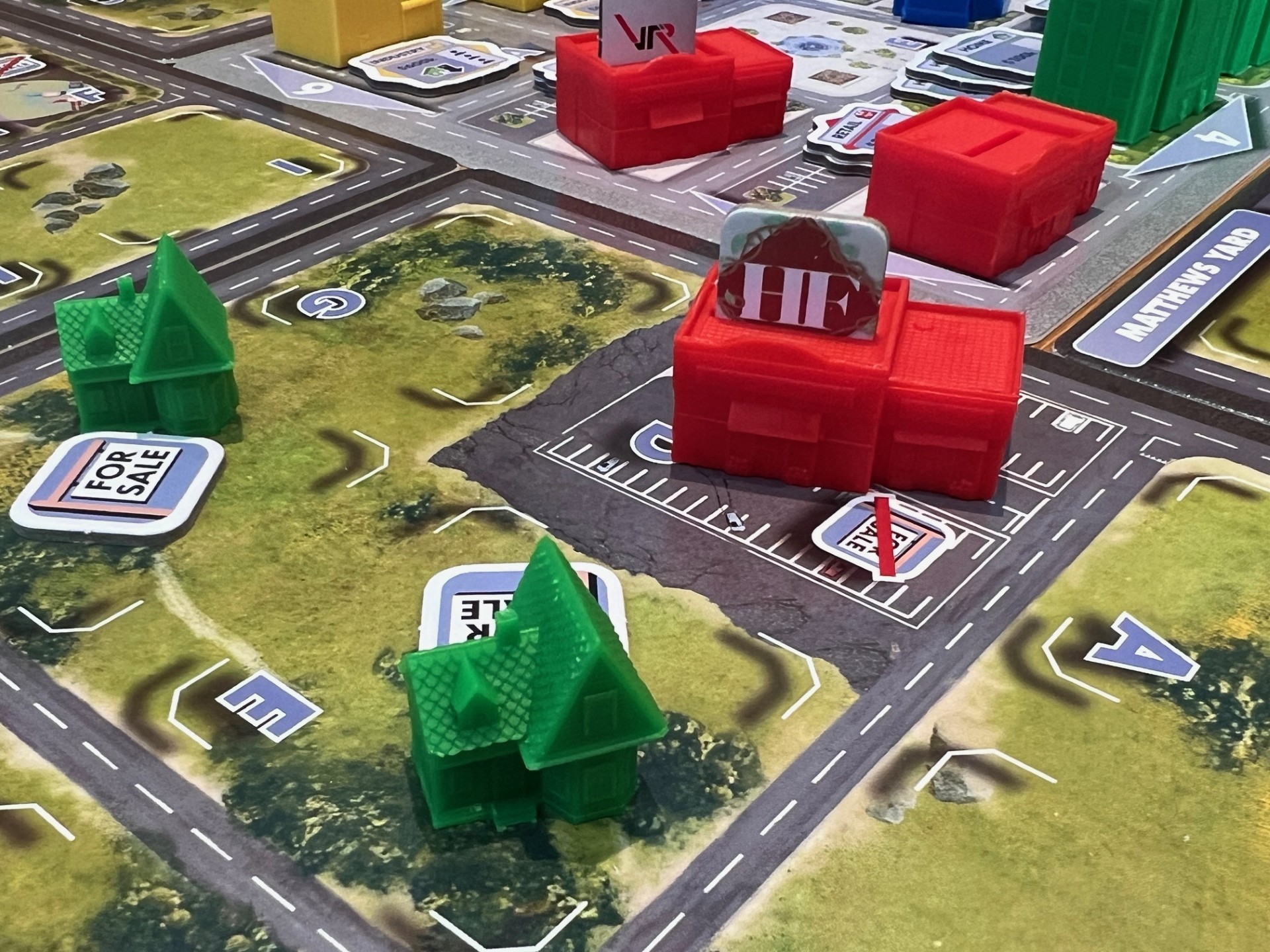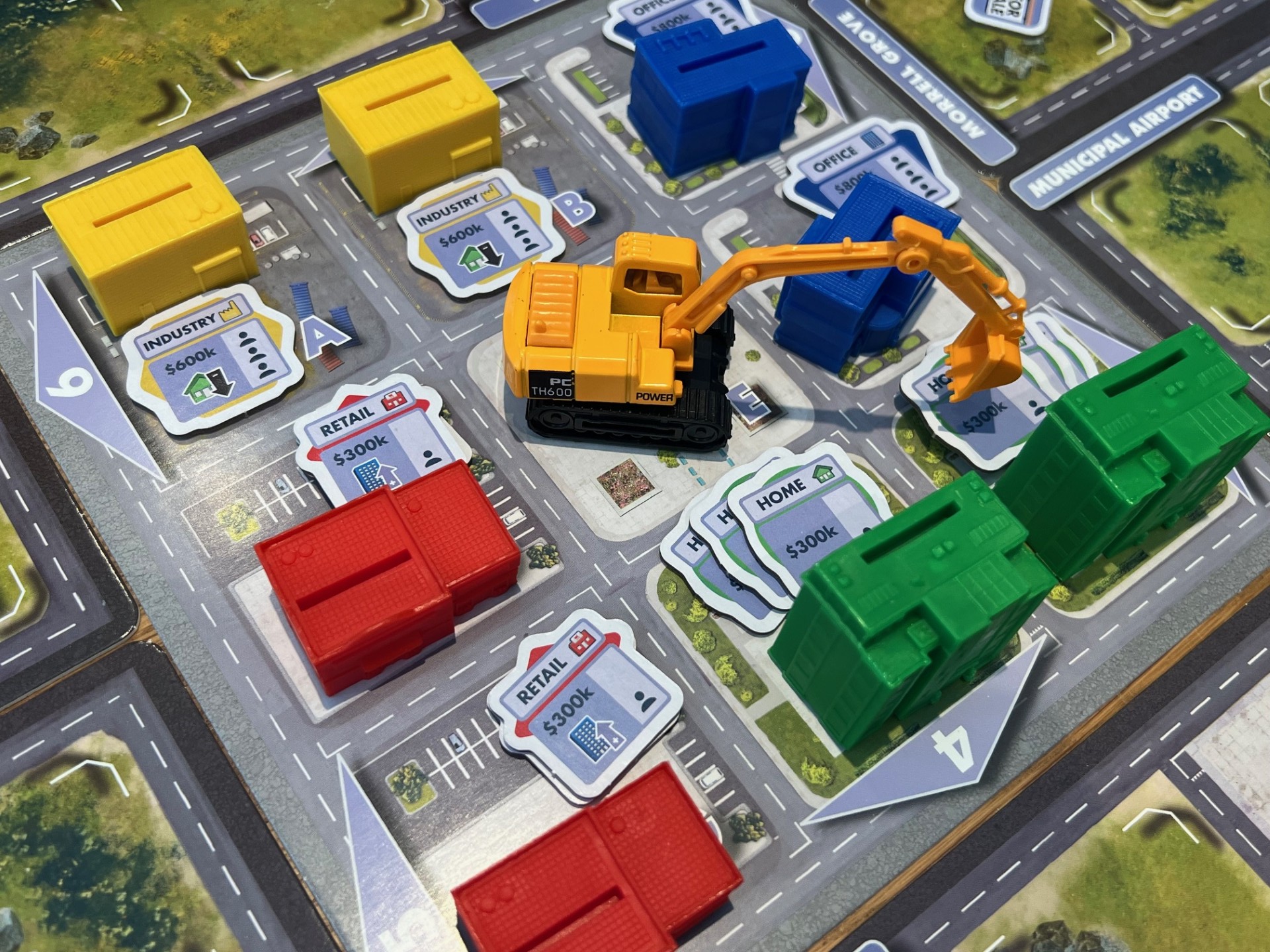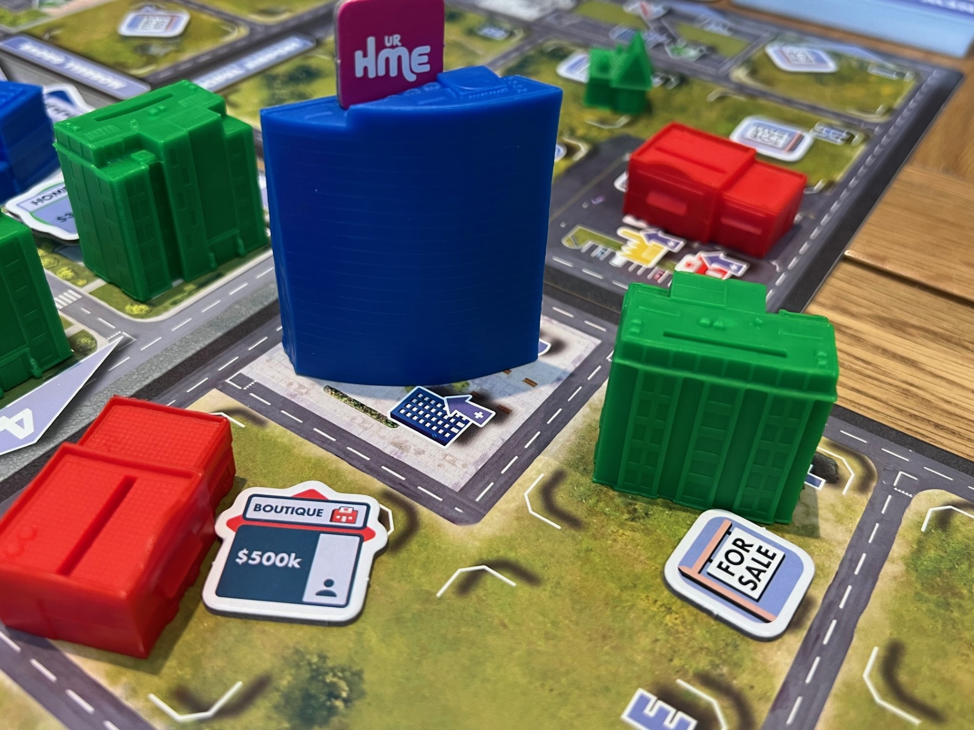 Each round, players bid on plots of land across a modular city grid. Land prices rise steadily, driven by player activity and demand. Once you own a plot, you can construct buildings — residential, retail, office, or industrial — each with its own cost and tenant preferences. Tenants are drawn randomly, and their presence multiplies the value of your property. Adjacency bonuses add further multipliers, and suddenly you’re selling a modest office block for millions more than you paid and it seems every bit as good as it sounds..