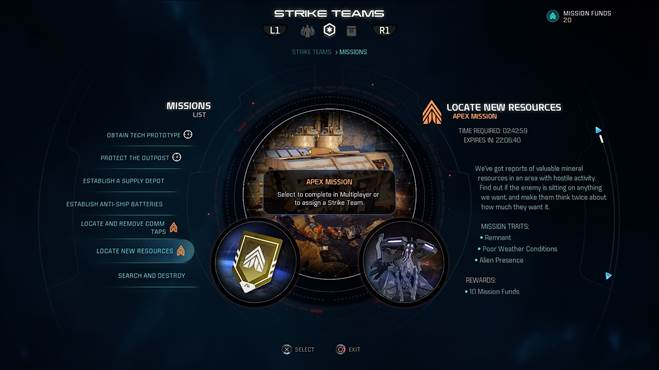 If you choose an APEX mission, it comes with a variety of rewards for the single player game and a small lore introduction on why you are doing it. You are also not tied into you actually doing the mission yourself as you can send away an AI team, which shows a percentage success rate instead, and just go on to play multiplayer with friends. Another good feature, is that you can do this in either single player or in multiplayer. Get in!