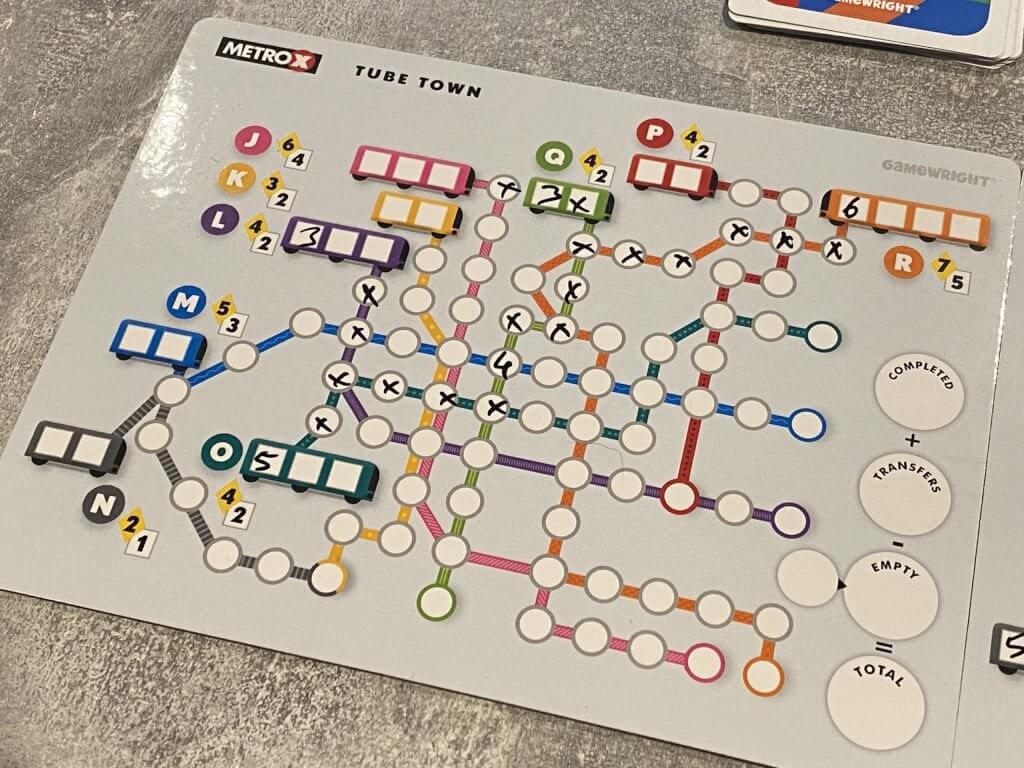 In any case, Metro X is not hard to learn once you’re actually in the game, and like most of the roll-and-write games that I’ve played, it has a very puzzly kind of feel. Sadly, there’s also a programmatic element to it — if you know the most efficient way to fill in the train lines based on which cards are drawn, then you’ll simply do better.