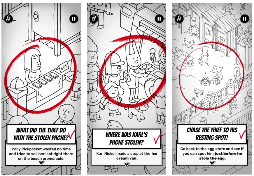 The core premise remains unchanged. You’re dropped into Crime City, a densely illustrated map teeming with mischief, murder, and mayhem. Each case asks you to trace one or more character’s movements through time and space, piecing together their story from visual clues alone. It’s Where’s Wally meets CSI, and it works because the map isn’t static — it’s a series of timelines. You’ll see the same character multiple times, each snapshot revealing a different moment in their day. Follow them from the bakery to the alleyway and you’ll uncover motives, disguises, tools of the trade and accomplices.