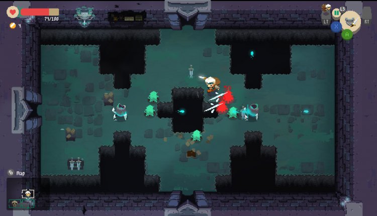 As the inherited owner of your late grandfather’s store, The Moonlighter — a haven for adventurers and merchants alike — your goal is to offer fine wares at fair prices to all who enter. You play as the oddly white-haired, yet spritely hero Will and your first dive into the perilous dungeons does not bode well. Armed only with the broom that you typically sweep the floor of your shop with, you take to the depths of the Golem Dungeon, only to find a bit more than you bargained for. A couple of tutorial rooms later and our hero is quickly overwhelmed by aggressive enemies, has passed out, and is promptly thrown out of the dungeon by some green goopy substance.