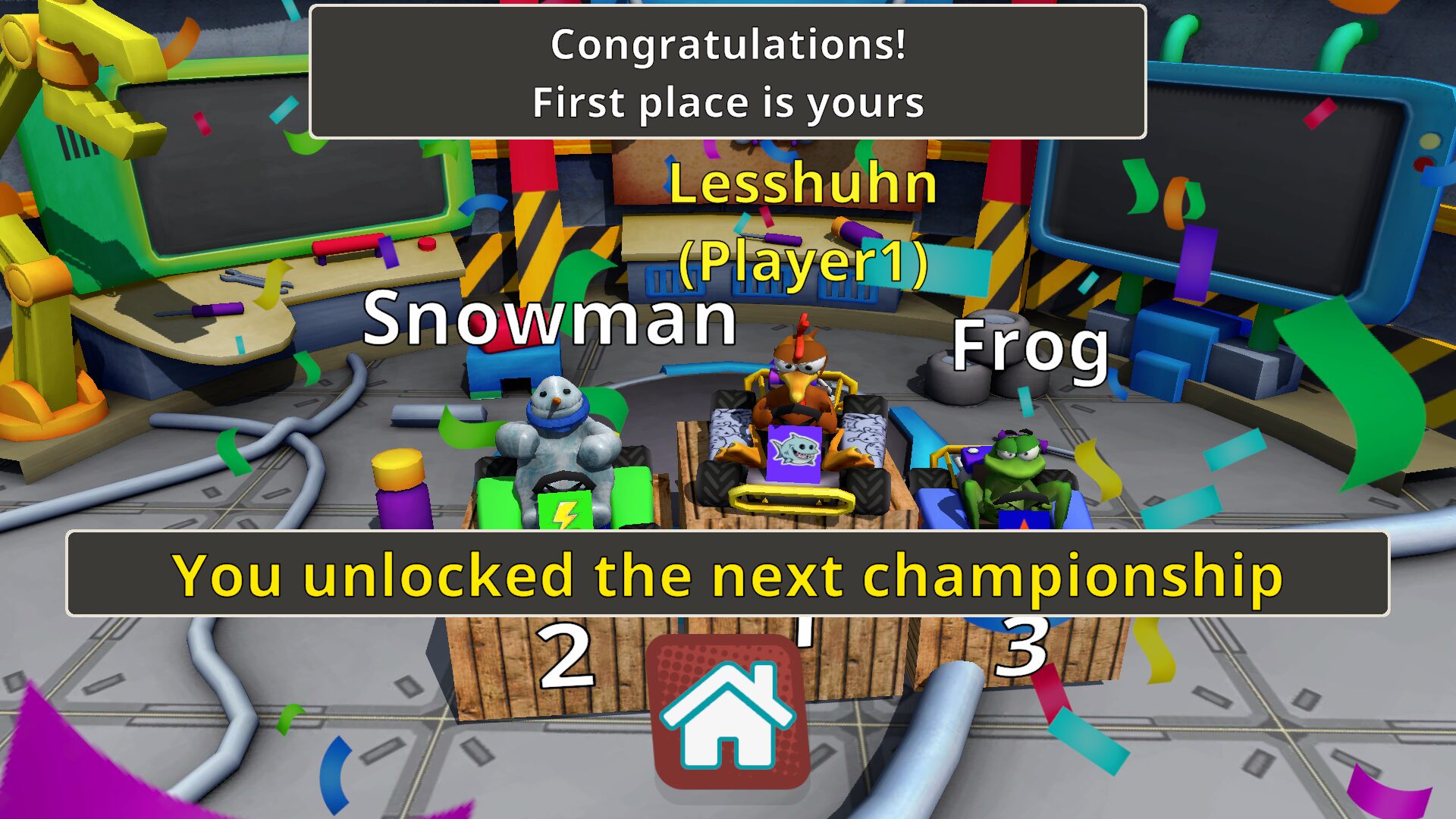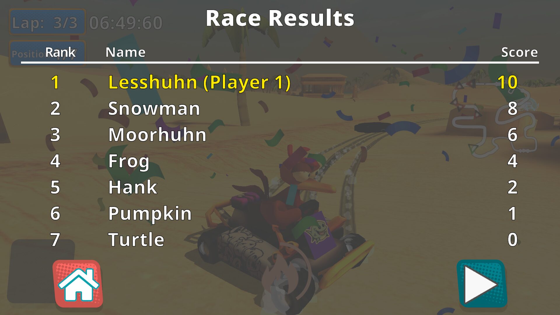 Moorhuhn Kart gives us a couple of mode options on the main menu for both Single and Multiplayer. The multiplayer is good old fashioned couch split screen, which I think some games miss out on these days. Single player lets you play one of eight tracks, or play four at a time in a championship. This was the mode I mainly played. There are seven characters to choose from, including a snowman, a frog and a pumpkin headed scarecrow — all with their own individual stat bonuses to your usual things, such as acceleration, top speed and handling. There are also ten different kart cosmetics, but these are cosmetic only.