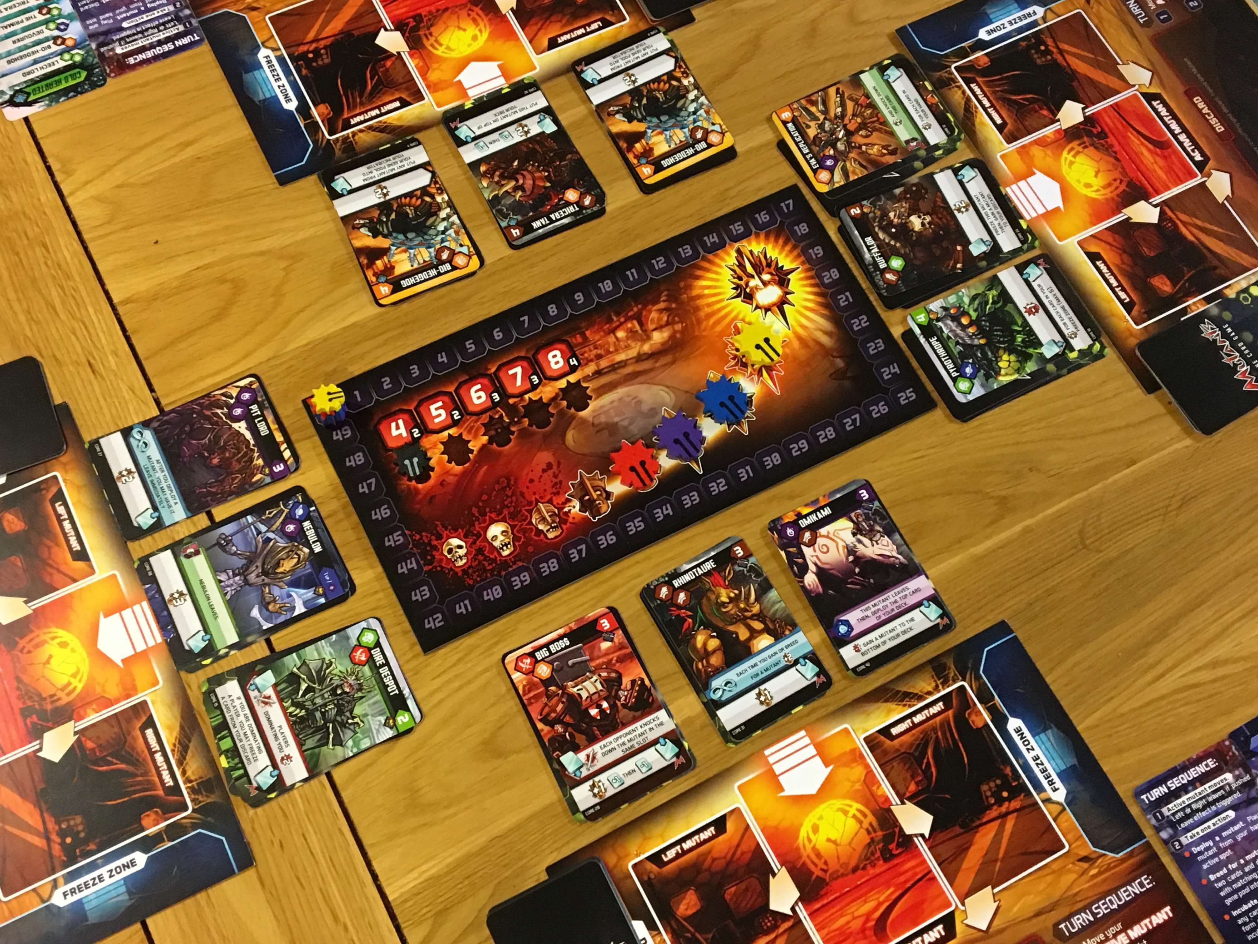 The copy of Mutants that I’ve been previewing may be, by no means, representative of the final production copies, but if it’s anything to go by, then the retail copies should be exceptional. The build quality is exactly what you should expect from a modern deckbuilding game — the cards are of standard size and thickness and there’s no reason to think that they will wear out unduly quickly. Both the central board and each of the player boards are even more robust, with a thick, hard cardboard construction. The wooden tokens that sit on them are colourful, though I don’t see how the central board art (or the tokens on it) tie in thematically to the game itself.