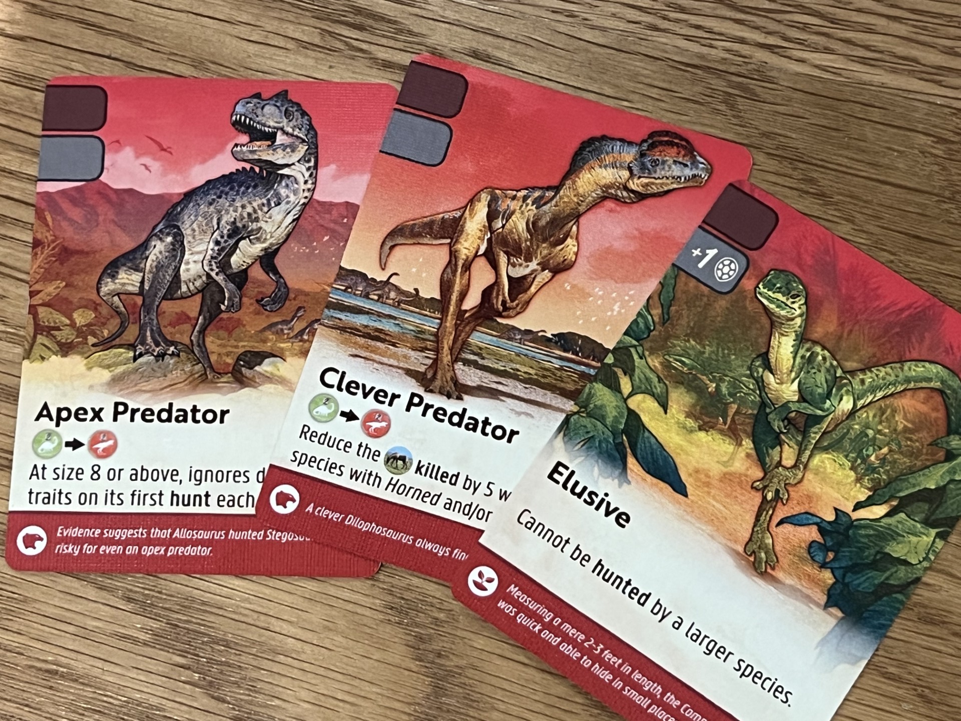 All of these actions are controlled by cards — and how you use them. Playing a card for its trait allows a player to add that trait to an animal (for example turning an animal with no skills into one that can take food from the supply after another animal eats (Scavenger). Instead, a card could be discarded in order to add either size or population to a creature, making it either harder to hunt (size) or more populous and therefore more able to eat (population).