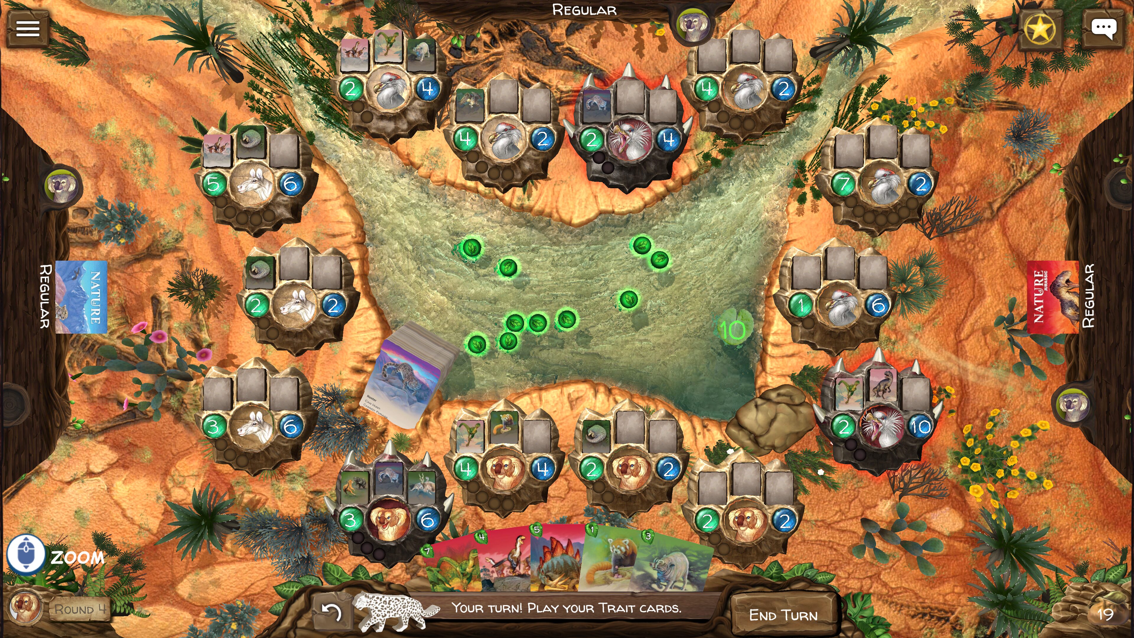 This system is both as simple as sounds and as powerful as you might expect from a card game that has been iterated for more than ten years, but perhaps the cleverest feature (which does return from the other versions) is that of the ability to save a card to then convert into food during a later phase. That’s right — sometimes you’ll want to grow and expand, but within a couple of rounds, the watering hole won’t generate enough food for all, so knowing when to stall your own species growth in order to feed (and potentially share some with your opponents) is a key decision.