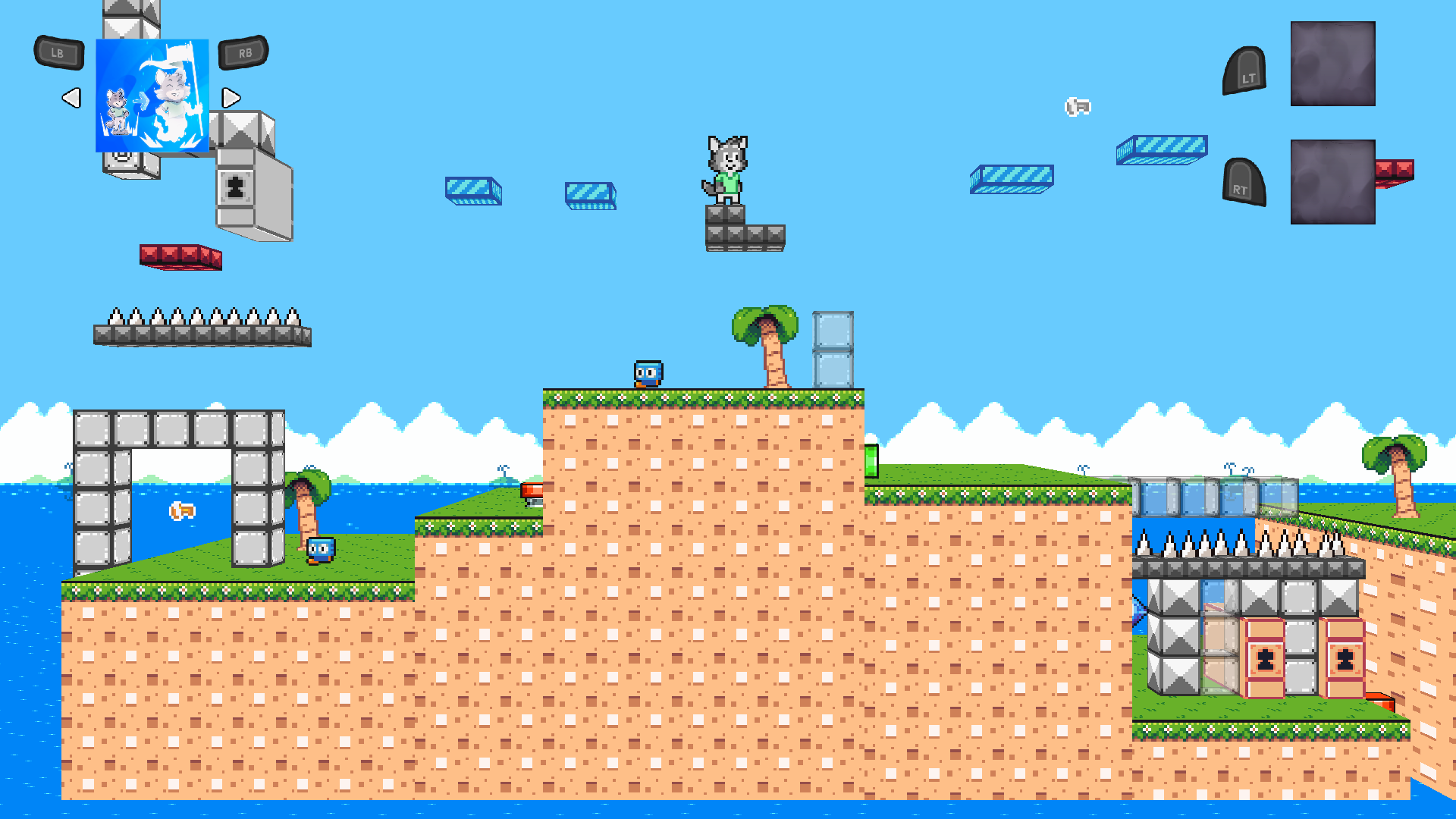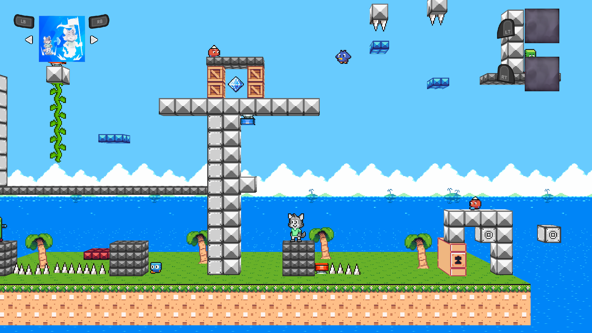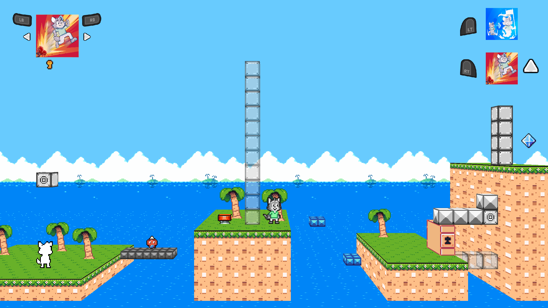 So, off Nico goes to conquer each level, using his new found powers to grab each level’s Power Crystal. To do this, he has four powers. The ability to SAVE his place in the level, then teleport to it later; he can SAVE his momentum when he bounces on a spring, essentially giving him a double jump; he can SAVE any items in his inventory, such as keys or shields, then LOAD them once used, duplicating his items; and finally, he can shoot a small pellet at enemies which can switch Nico’s location with theirs, helping him to reach places otherwise inaccessible to him.