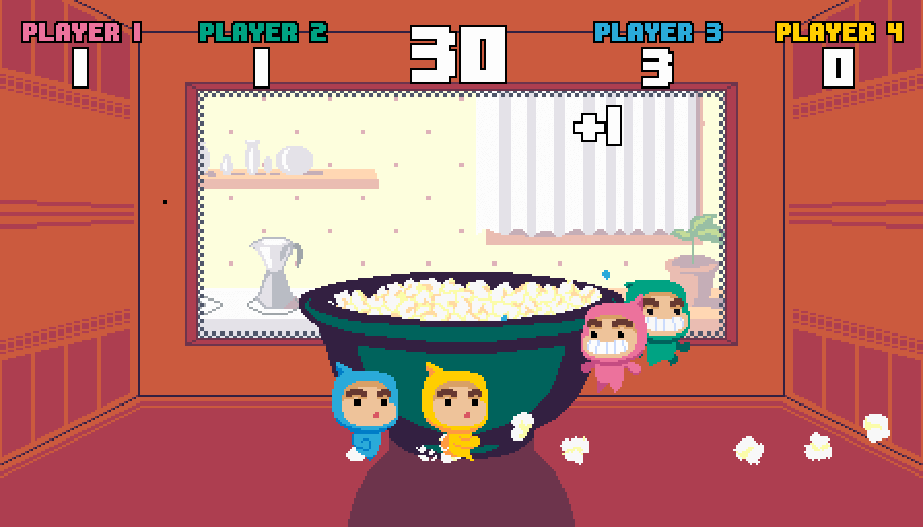 Every once in a while, a human comes by and peers into the microwave. If the human spots you, you freeze up for a significant amount of time, letting fairies hiding behind the bowl gain an edge over you in the glorious task of collecting the corn. Once all of the popcorn is popped, the round is over — whoever ate the most is crowned the winner.