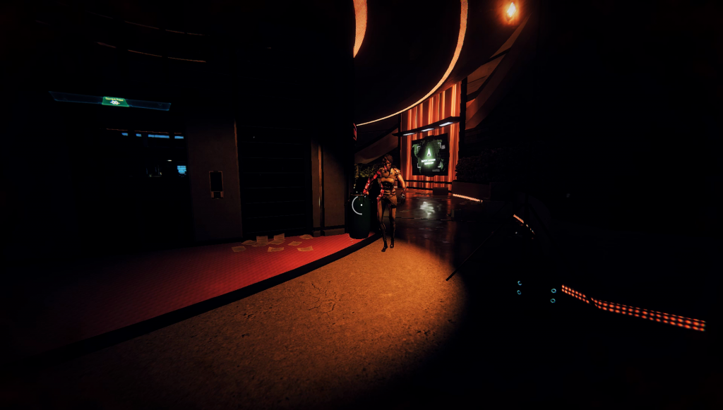 The armband and partnered scanner is a key part of the game. It handles all of the in-game menus, from status to inventory, from building to upgrades. It’s also, as I said above, a scanner which will highlight elements of the environment relevant to you, be that interactive objects, or the games locked boxes which you hack using an interface on the armband in a minigame where you have to stop a spinning line as it passes a relevant section. If you stuff that minigame up you’ll alert security who will either detain or murderise you.