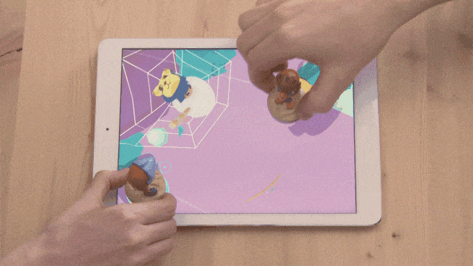 The two statuettes, which are powered by a small static charge from human contact (a technology from Volumique), are moved around on the screen; with the charge, and the markings on the underside of the figurines signalling what is where to the game. In addition to capturing the location of the toys, due to the nature of the markings on the underside, the game is also aware of the facing direction – which ties into the navigation aspect.