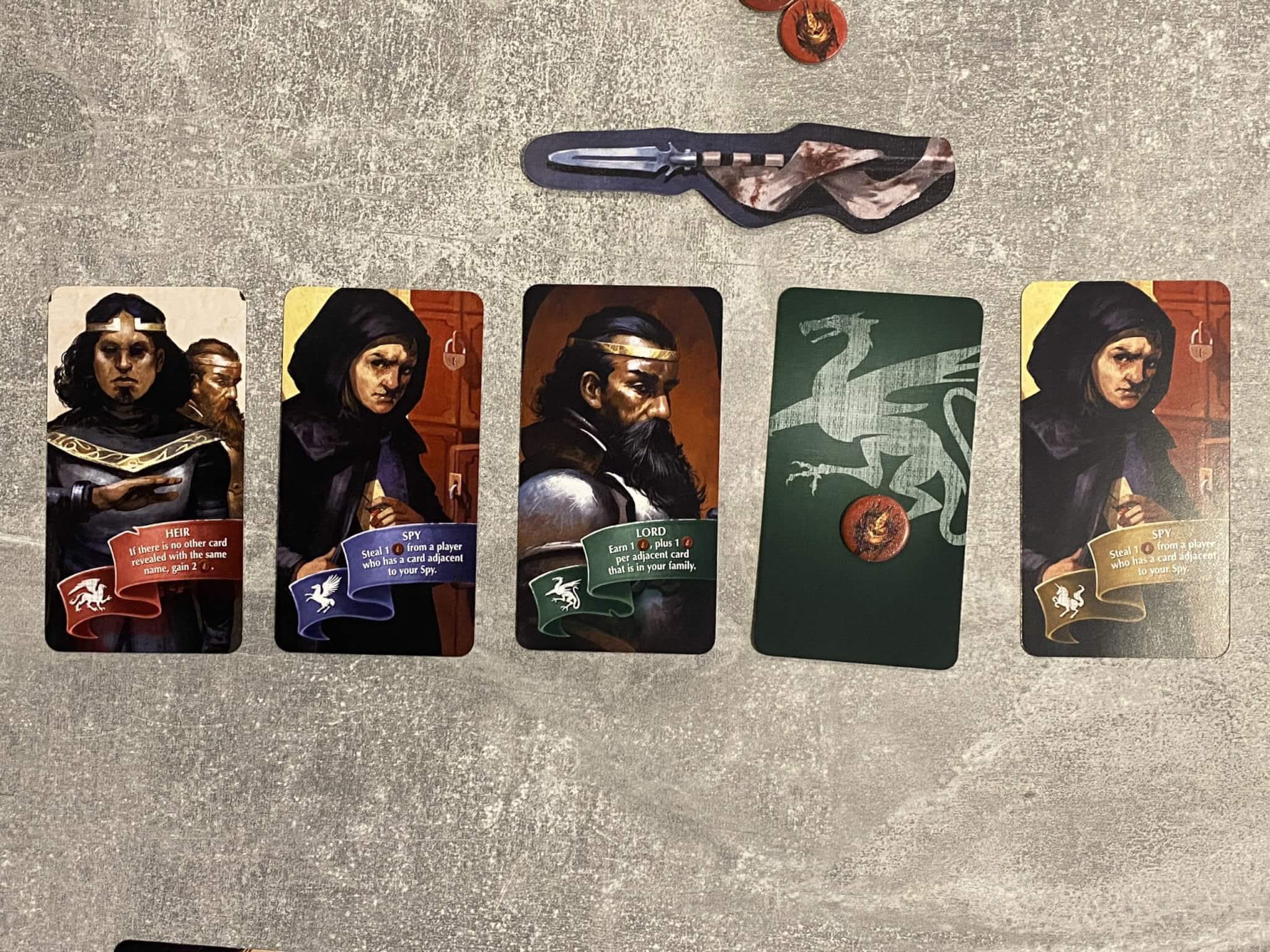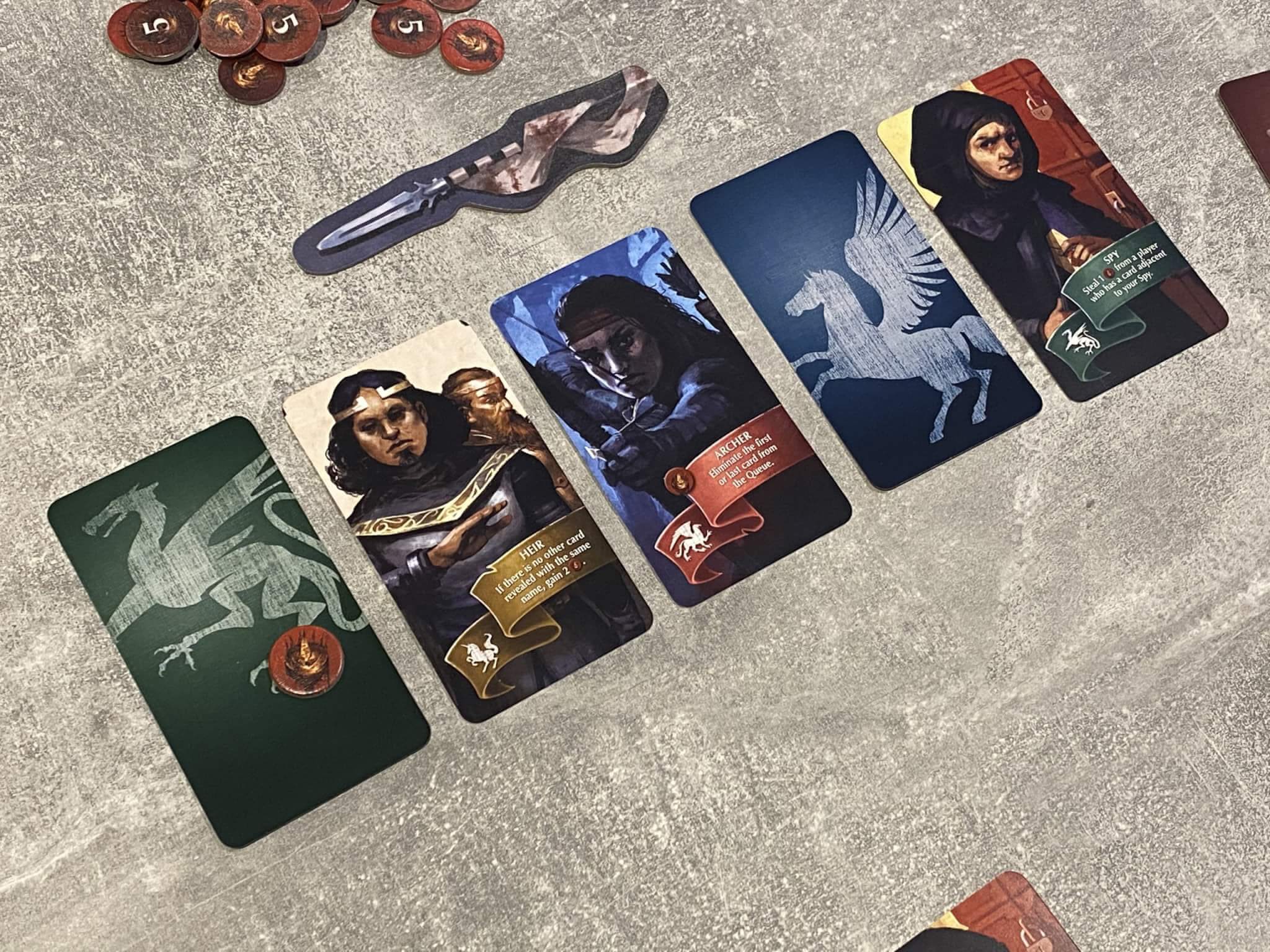 The actions on any existing face-up cards are also resolved, and these actions vary quite a bit depending on the card. Some abilities such as Ambush or Assassin resolve immediately when turned face up and are then removed, whilst some, like Archer or Heir remain in the row until another card effect removes them.