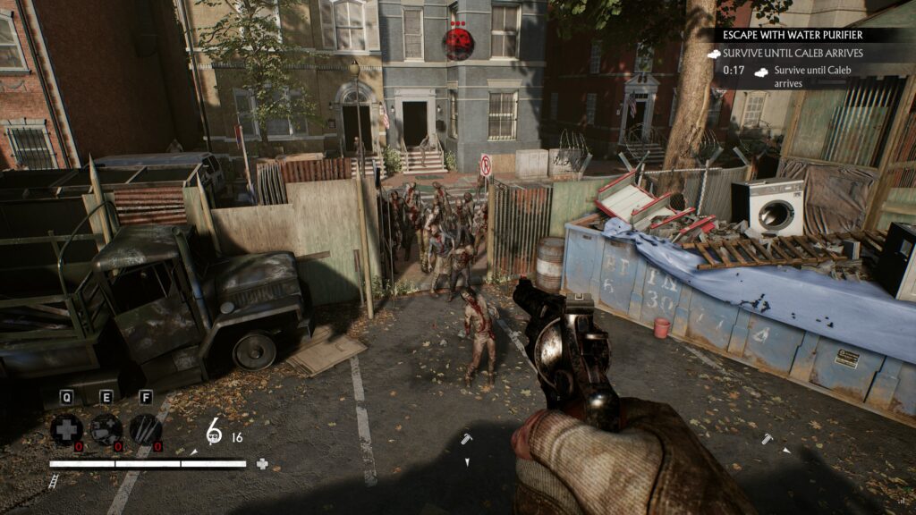 Hell or Highwater is a mission that has you attempt to recover a water purifier that was stolen from your hideout. The mission had me working my way through a densely populated town teeming with the dead and some living in hopes to recover what had been stolen. One mechanic of this sort of level was a noise symbol at the top of the screen which was ever present but I had no idea what it meant.