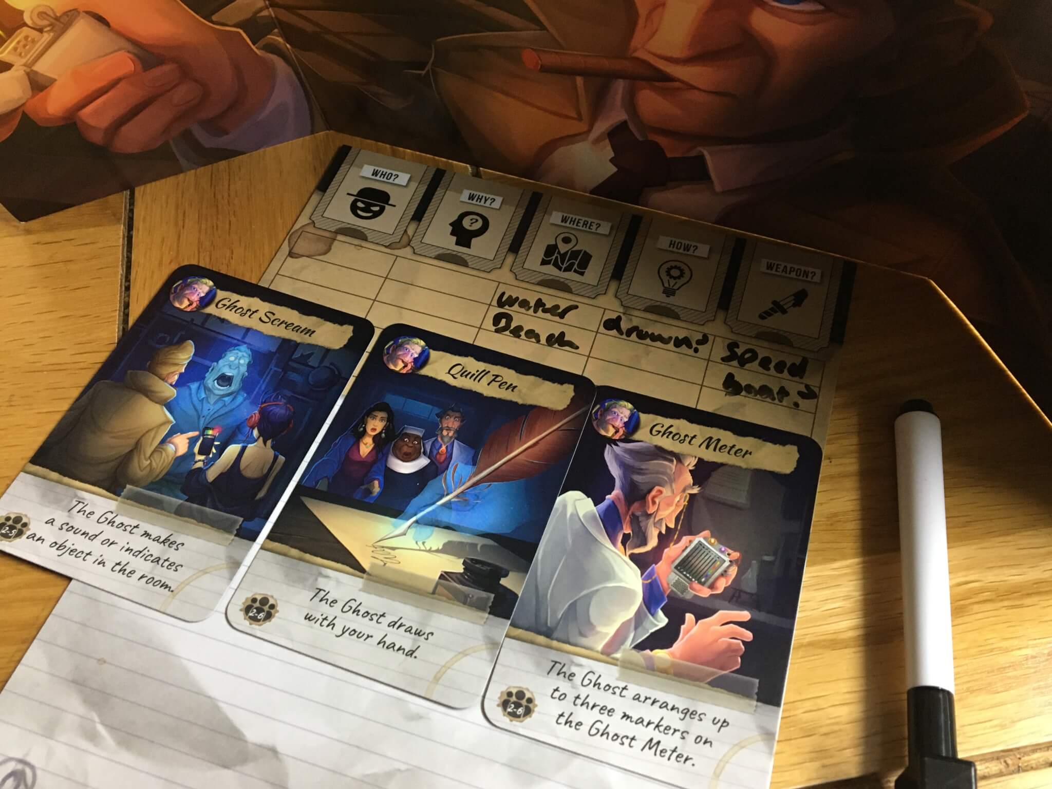 Twice per game, each detective can make a guess at solving the whole mystery. When they do so, the ghost player will use one of the included dry erase marker pens to write how many aspects of the mystery that the guessing detective has guessed correctly (assuming that it’s less than all give). If a detective makes a second incorrect guess, then they are eliminated from the game until the mystery is solved and the next game begins. The detectives will use a dry erase board of their own to keep track of the various answers provided to them and/or other players wherever they’ve been able to take advantage of what was passed on.