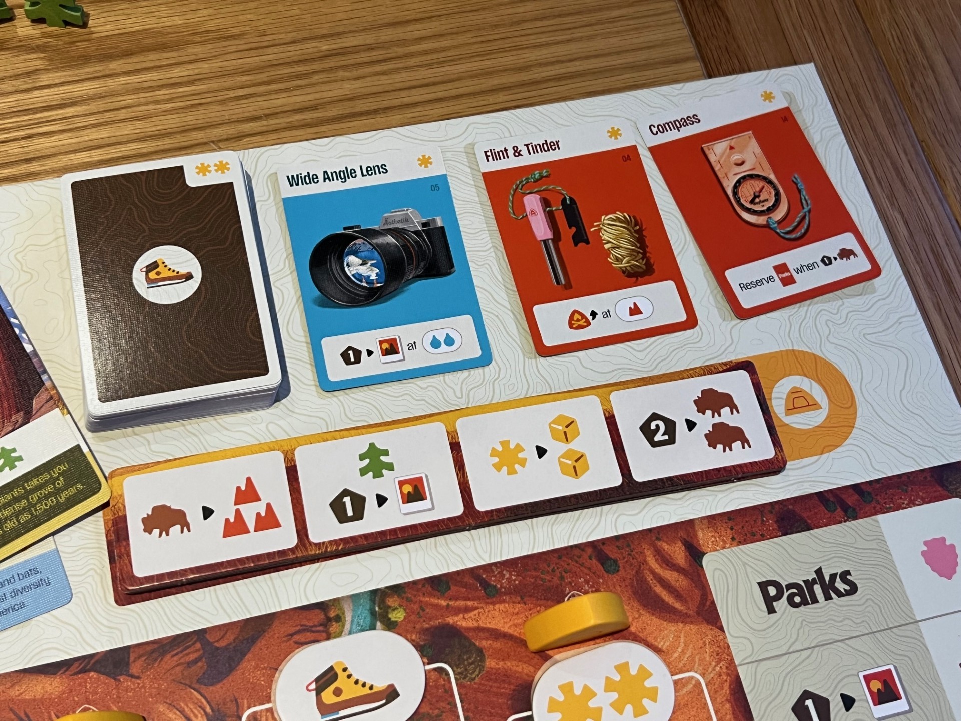 When a hiker reaches the end of the trail, they will be placed onto one of the three rows of options — the first allowing them to take the first player token with immediate effect, the second allowing them to buy gear (potentially at a discount), or to reserve or visit a Park card. To reserve a Park card, all you need to do is say so, then add it to your tableau — it doesn’t score at this point, but you can then be safe that no one else can visit it before you.