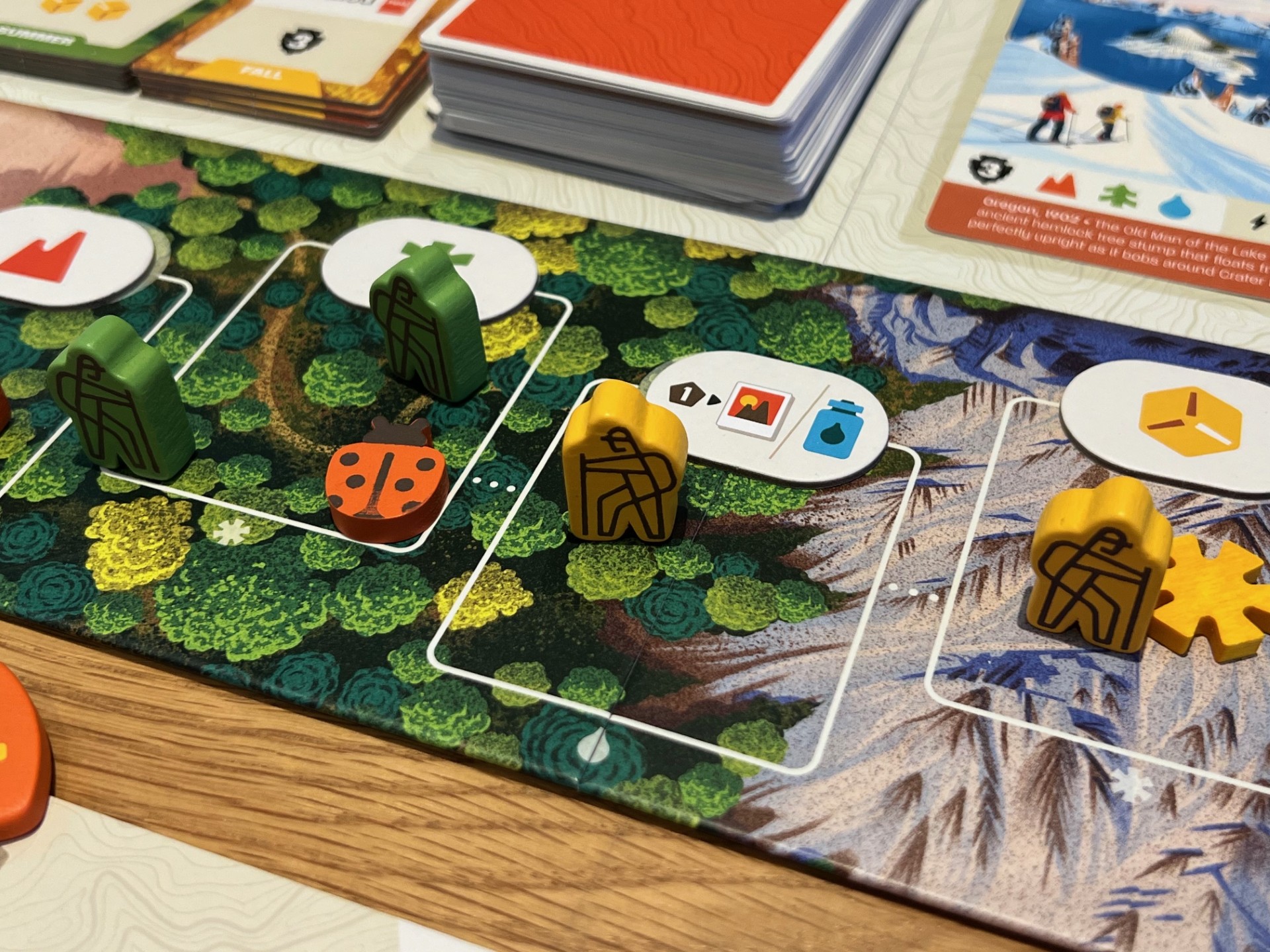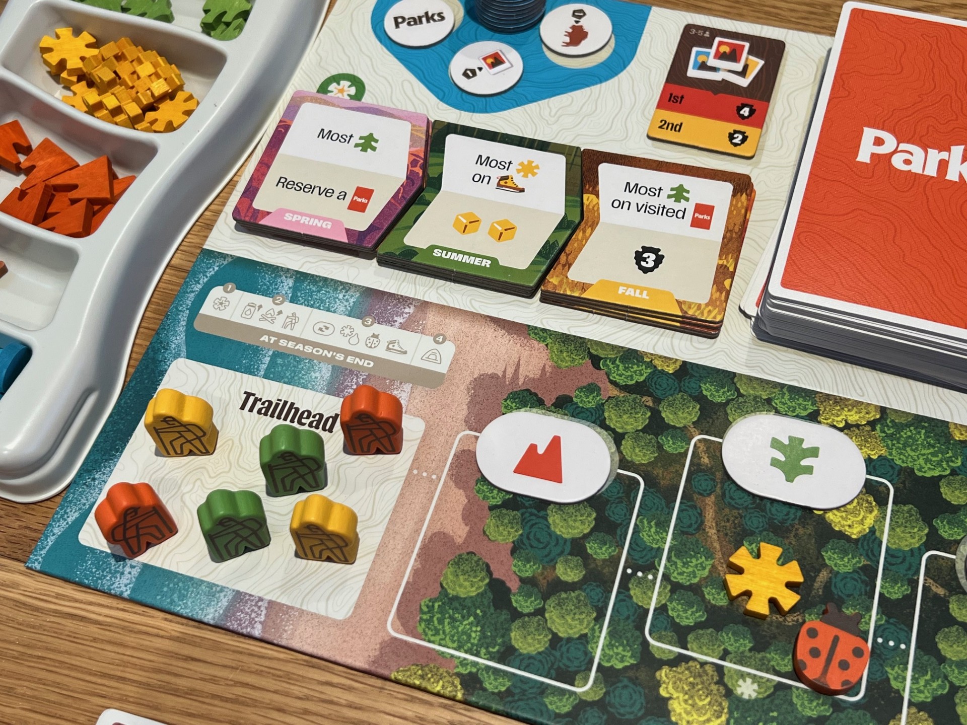 The objective remains straightforward — after four seasons of hiking, the player with the highest points total across their parks cards, the photos they’ve taken, and any other source (such as the first player token, which can be claimed at the end of a season’s hiking) will win.