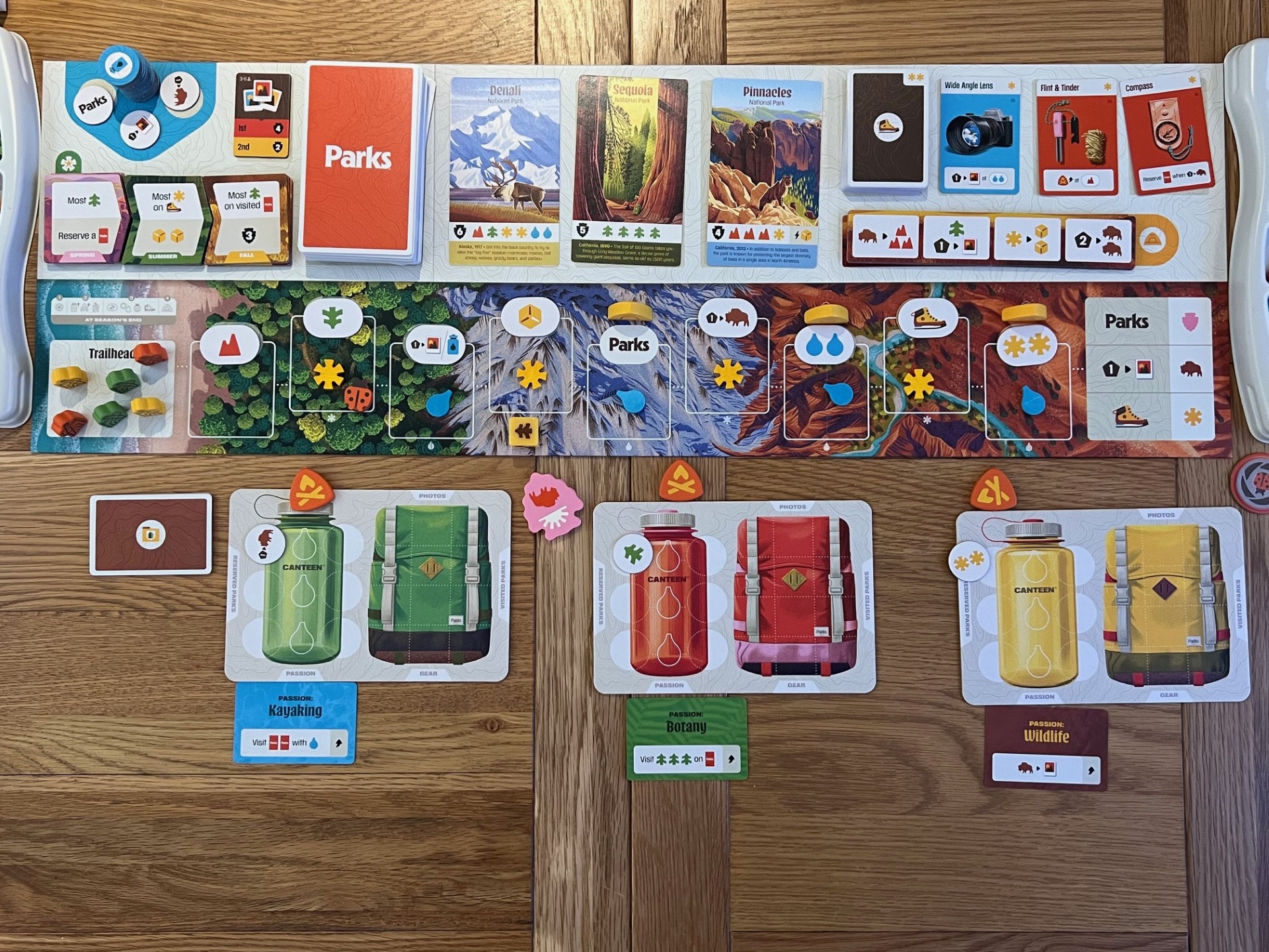 A small and simple tableau or engine-building addition bolts on, with combos between Gear and Canteen cards very possible, and other factors like the first player and camera tokens adding a light dusting of additional complexity. The beautiful artwork and relaxing setting do no harm either, and Parks always results in lots of close examination of cards and people admiring what is included in the box.