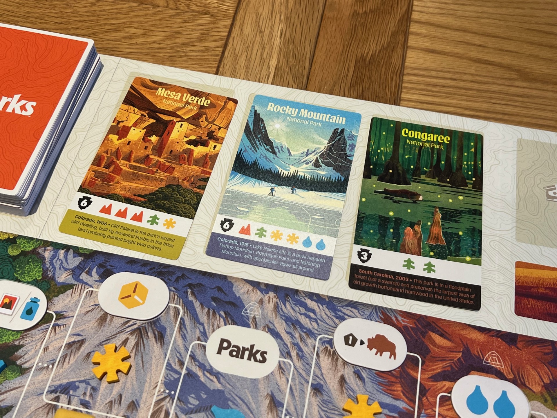 The realisation that the beautiful construct of Parks is simply a resource conversion engine might feel a little underwhelming at first, but once you actually get into playing Parks, you realise that the gameplay has a lot more to it — including some of the “skipping ahead for some reason” type decisions that you’ll find in rondel games, and also decisions about when to invest in optimising your engine instead of purchasing park cards directly.