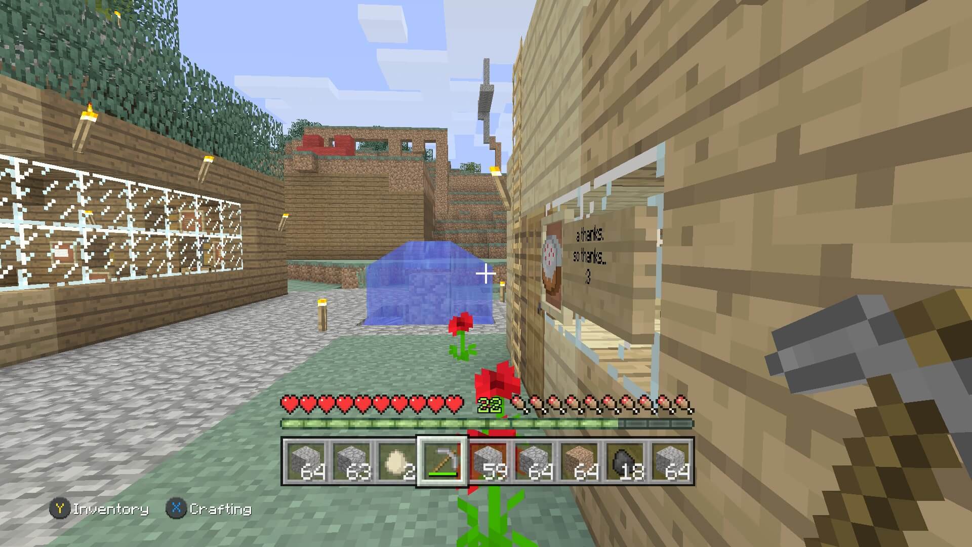 The world I’ve chosen is a relic. It’s a shared world with three others, and while I can’t immediately place a date on its creation, so look around to find some telltale sign of an item yet to be implemented in that build. I make estimates based on a lack of mutton and jungle wood, but stacked signs and the ability to climb vines, about which a great deal was made at the time.