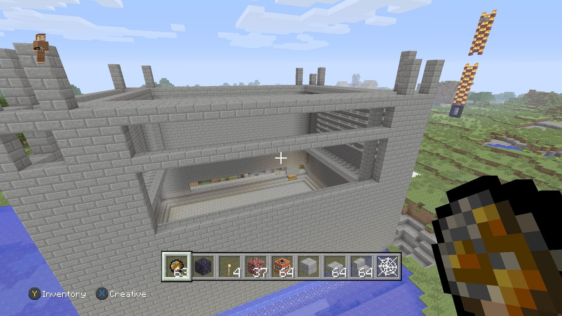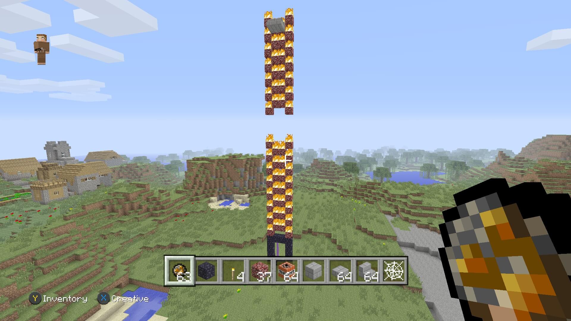 I load up a world that used my home telephone number as a seed and I spawn in creative mode on a flaming platform in the sky. This map was supposed to be a challenge map, where I would design half and my sister would design the other half. As always we ended up getting engrossed with ideas, and unfinished remnants exist.