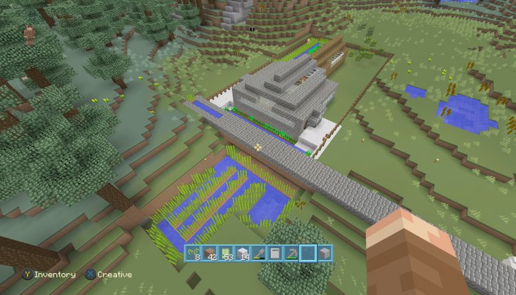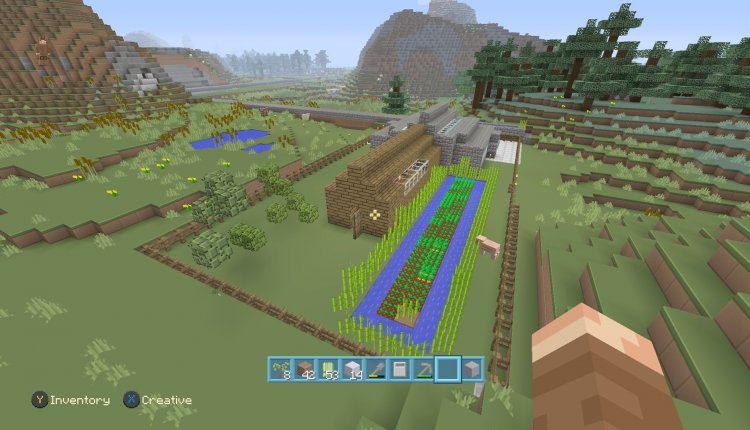 On the overcrop, there is a fenced-off area, which may have been my first successful implementation of animal breeding. Most of this world was created outside of creative mode, including the weirdly shaped house.