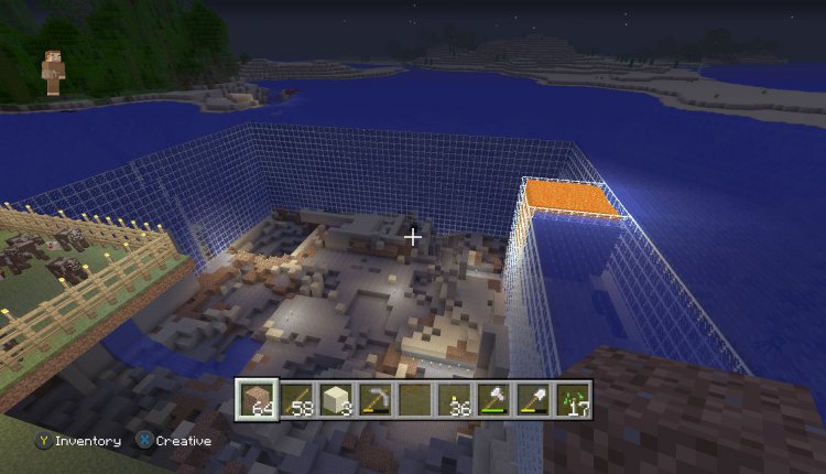 We spent hours using sand to block out the water. Remnants still linger. There are chests full of flint and steel. There are and stacks and stacks of TNT and spawner eggs, from when we decided to try using creepers as an alternative. It saved some time in the long run, but had a messier cleanup. A swimming pool full of lava is clamped onto the side, the idea being that the lava would act as a catalyst plugging the holes, with the reaction creating cobblestone. The pit is more interesting to look out of than at.