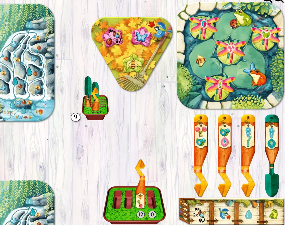 The components in Pergola are excellent. The tiles are thick and satisfyingly chunky, with clear iconography and a soft, inviting colour palette. The artwork is clean and consistent, evoking a sense of calm without ever becoming bland. Other standout features are the individual plant pots — one for each player — which serve as both a thematic touch and a functional player aid. These pots hold player components during storage, and act as “tool stands” for those tool tokens during the game.