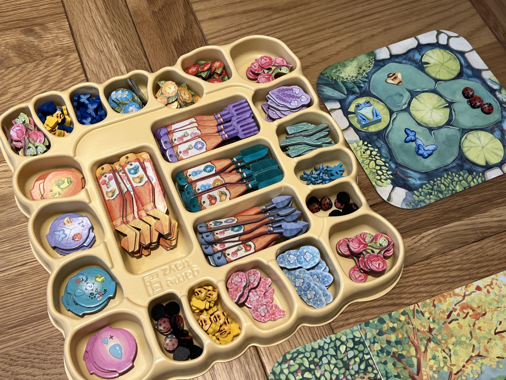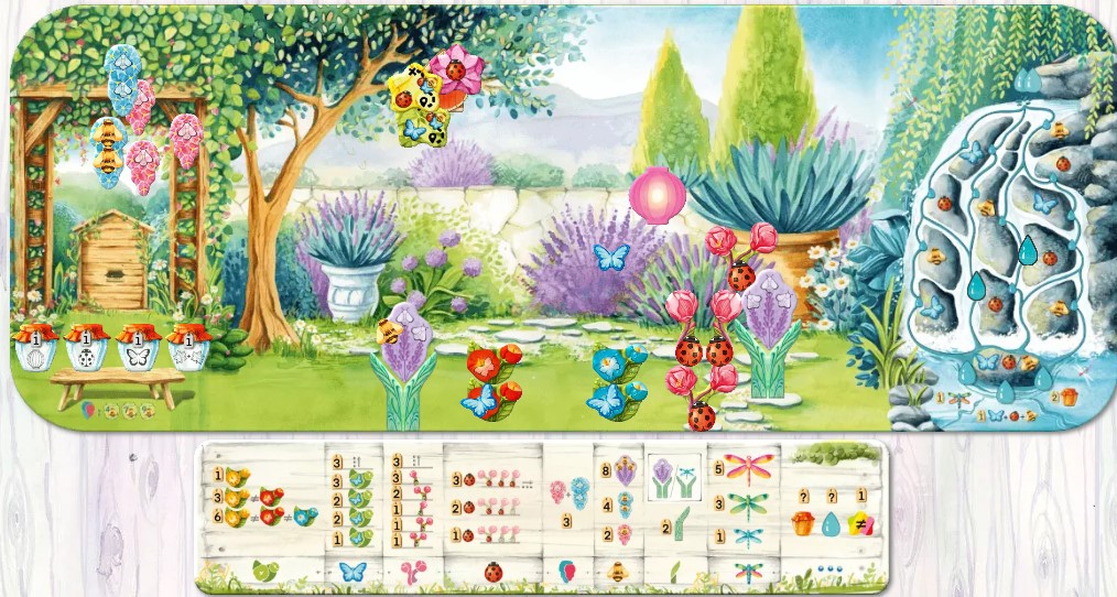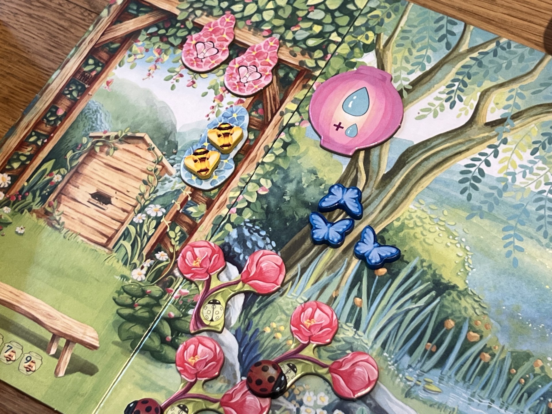 Each player takes turns placing tiles into a shared grid, gradually building a communal garden that everyone contributes to. The tiles themselves are made up of different plant types and colours, and the aim is to complete specific sets of plants and ultimately, insects which each score points.