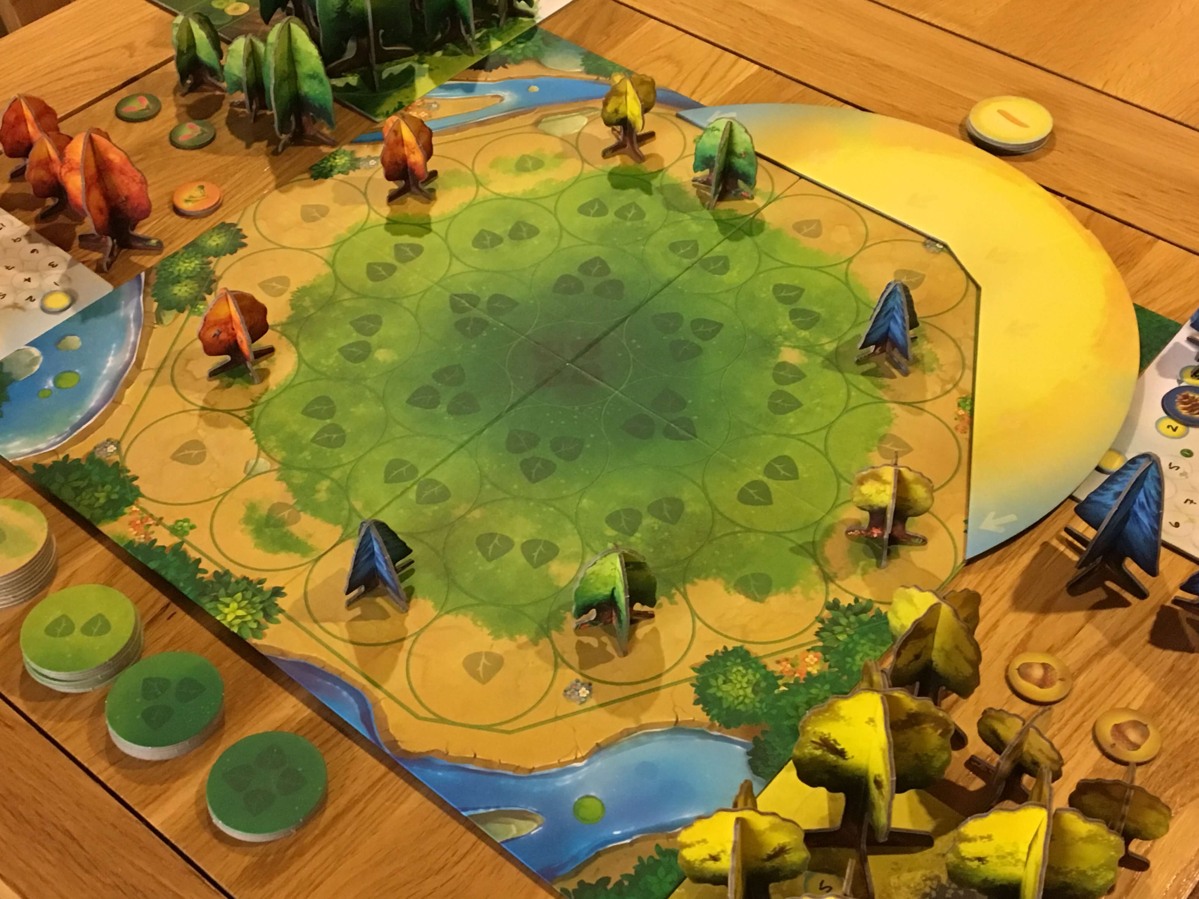 The player who has the most cumulative points (with a small bonus for leftover light) at the end of the game will win, and each game lasts for three (in the short game) or four (in the long game) full rotations of the sun around the board. This effectively means that there are either eighteen or twenty four turns for players to collect light, plant seeds, upgrade trees and then harvest them, so every decision needs to be made carefully and each tree should be positioned to make as much light as possible — whilst, if possible, denying it from your opponents.