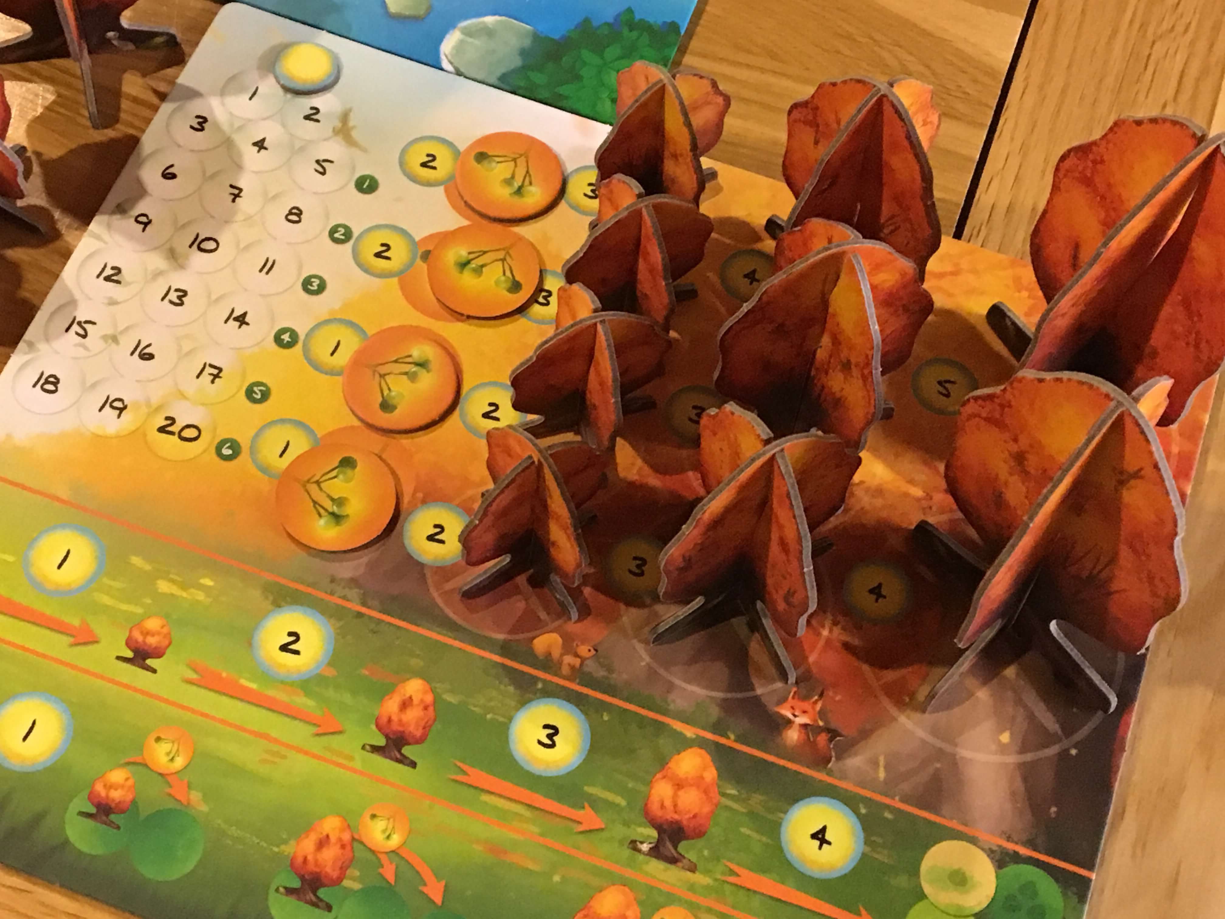 The first thing you’ll notice about Photosynthesis once you’ve laid it out on your table is how diverse the four different species of tree are. This is impressive enough with the trees laid out in their own ranks on the individual player mats, but once the board is populated in a four player game, Photosynthesis is truly a thing of beauty. Assuming you want to look closer (which you will) then not only is the overall effect gorgeous, but so too are the small touches. The squirrels and birds that inhabit this cardboard forest peek out at you and every tree seems to have been individually painted.