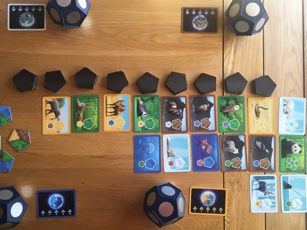 Planet is relatively simple to play and understand, given that only two factors will score at the end of the twelfth round. The first of these scoring factors is simply the count of animal cards each player has, whilst the second relates to one of the five objective cards that are secretly dealt during setup. Each player will be focussed on developing one of the types of habitat (tundra, desert, sea etc) and will score points depending on how much of their planet is covered by that kind of terrain.