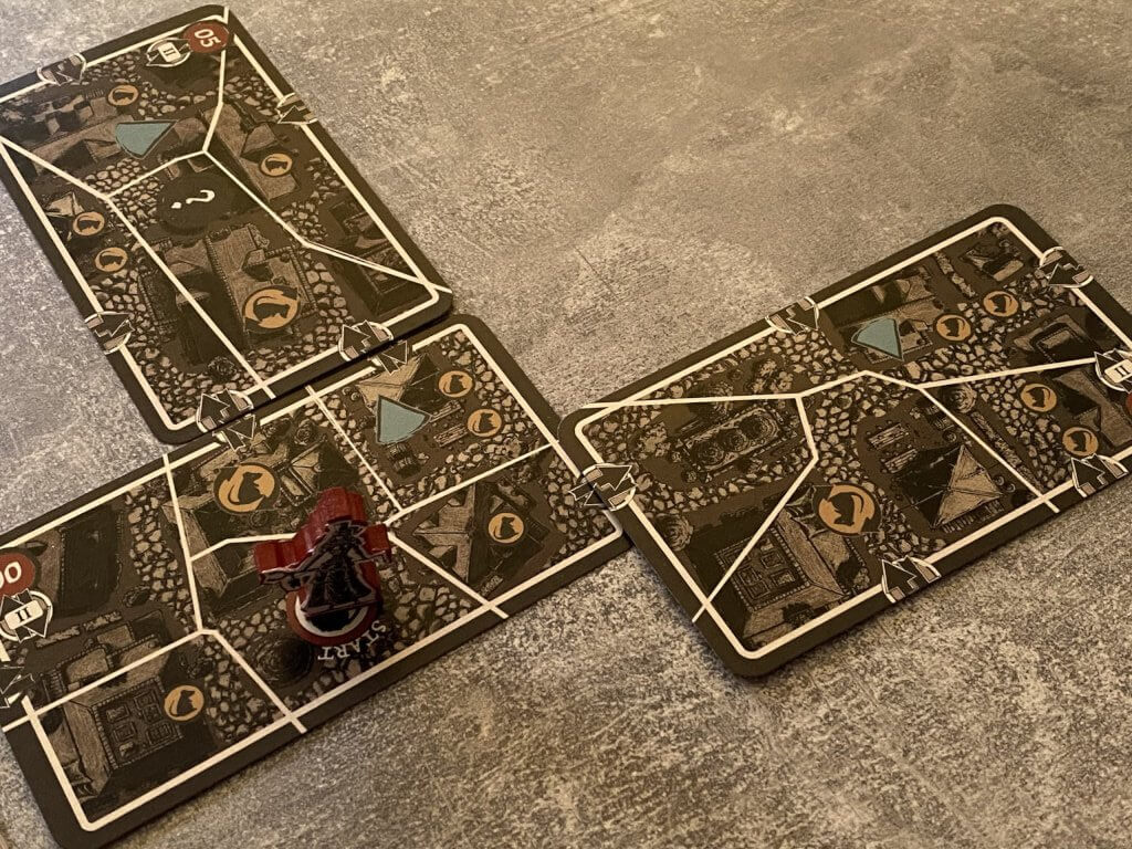 A big part of the challenge here is that as the existing areas of the map are cleared, the game dictates that new cards be drawn and added. These cards must be added via connections between the cards that are (generally) uneven, meaning that the board can become a bit chaotic later in the game. It also means that sometimes, you’ll need to add a new card to the opposite end of the map at which you are placed, which is bad.