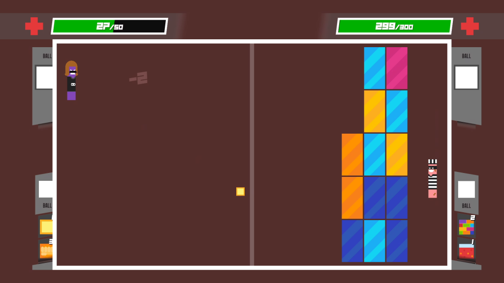 This brings me onto the battle system, as it were. Fights are “fought” in standard pong fare. Or so it would seem. Each character, including yourself, has a health bar. Each hit of the ball will reduce this bar by 1 (by default at least) and scoring a point reduces it by 5, until a player goes into a critical state. At this point, the opponent will move slower, and needs to be finished off by scoring a classic point, pong style. You continue to fight your way through the dungeon, beating enemies, picking up loot, and exploring through various floors, eventually finding yourself face to face with the boss of the dungeon. These fights are a lot harder, with the opponents having a lot more health than you, and often very special abilities you would not have seen yet. The bosses are always on the last floor of the dungeon