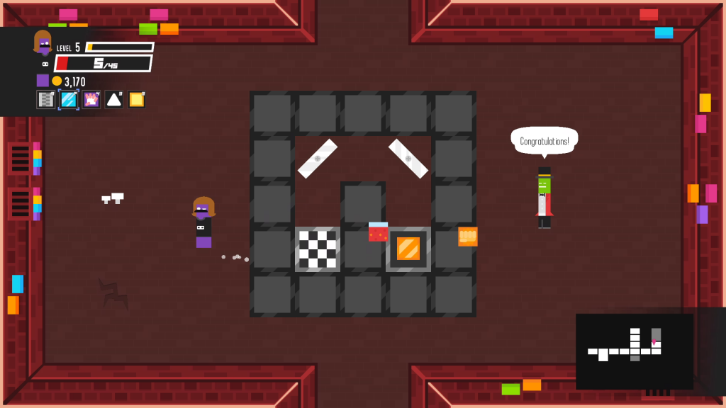 Cash can be spent in the various shop rooms you will also find, selling items to help you on your quest, or simply cosmetic items to ensure you save the world in style. Also, on each floor of the dungeon, will be a character with a challenge for you. These are purely optional but do expose the different ways to play. One wants you to clear all enemies, one rewards a pacifist run, finding the exit without a single battle, and the last will ask you to map out the dungeon, visiting every room… Which can be quite the task.