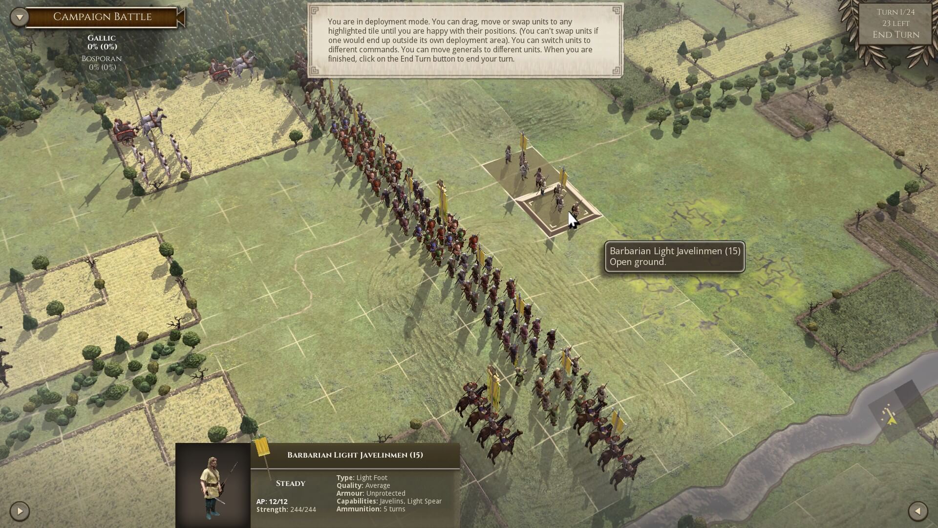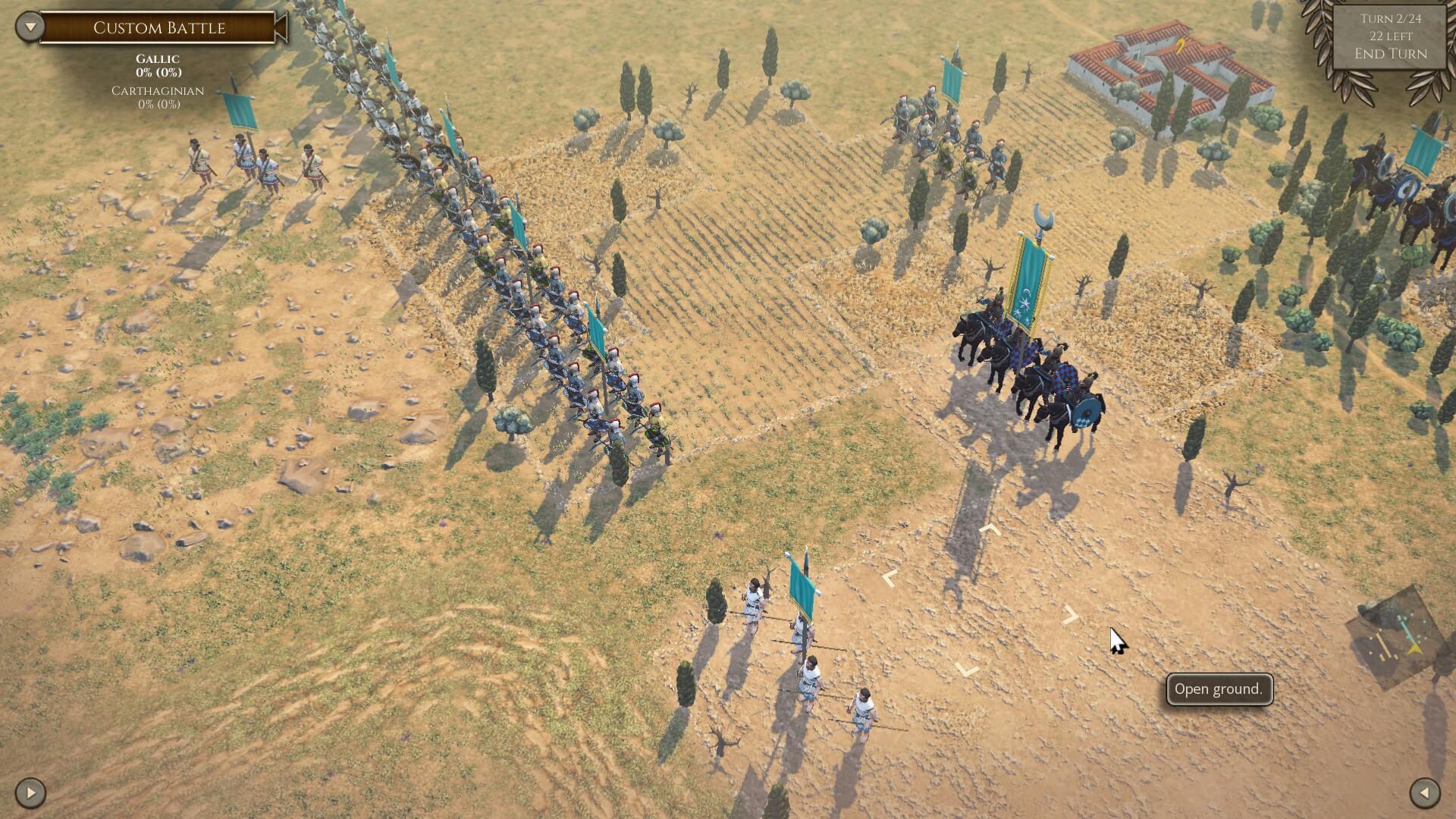 The final types of battle conflict are the Epic Battles. Field of Glory II comes with 12 pre-constructed historical scenarios of, obviously, epic proportions. These range from 255 BC to 49 BC; from the Carthaginian-Roman Battle of Bagradas to the Caesarian and Pompeian Battle of Thapsus. Firing up any one of these is awe-inspiring in size and scope, to say the least. You must come prepared to make a plethora of decisions if you plan to strategize for any battle of this magnitude.
