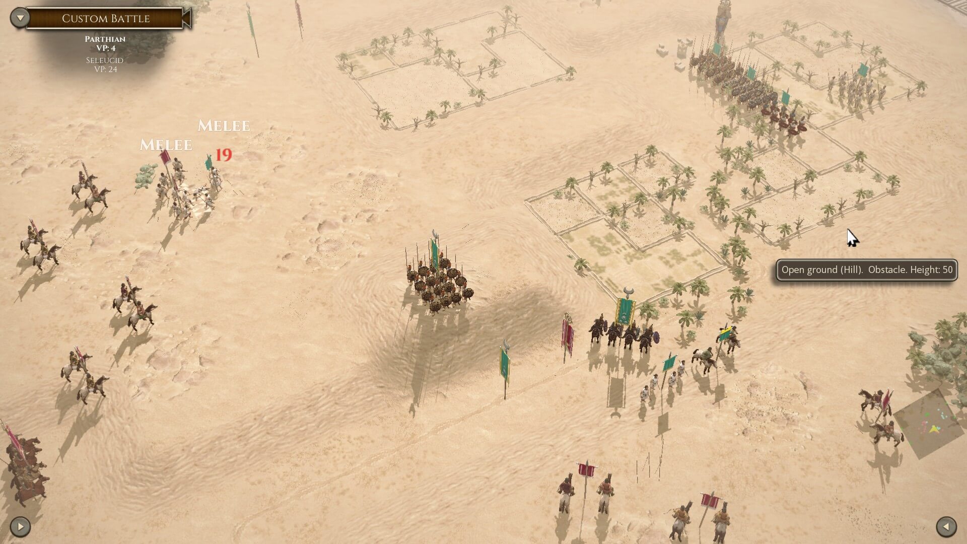 To start the battle choices, from simplest to most complex, Field of Glory II ships with predetermined Quick Battles. These are smaller skirmishes for you when you just need a quick taste to satiate your ancient conflict needs. The easiest and fastest way to get into a battle is to hit the “Fight Now!” button. The game quickly and immediately takes care of all of your decisions: the scenario, the two opposing forces, the map, and the victory goals. It is as simple as that. (My first try gave me Carthaginian v Roman, while my second one brought me Parthian v Armenian.)