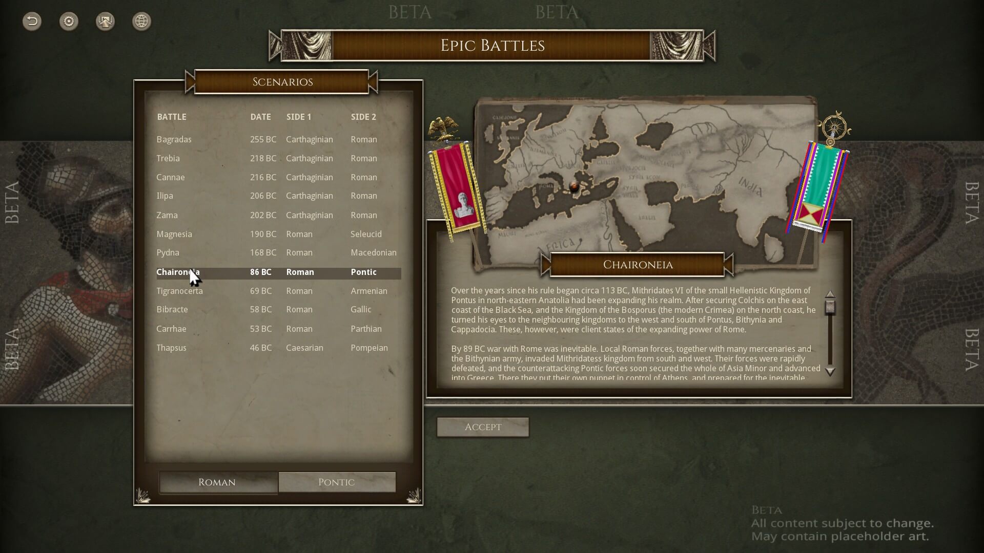 Field of Glory II ships with four preset campaigns that follow a historical narrative of an ancient general. These are Julius Caesar, Hannibal, Mithridates the Great, and Pyrrhos of Epeiros. They will fight multiple enemies, sometimes with, or sometimes without allies, over a series of battles.
