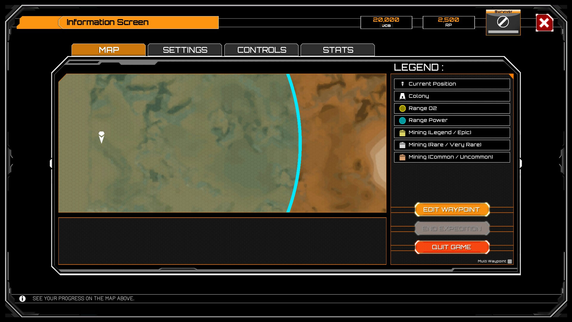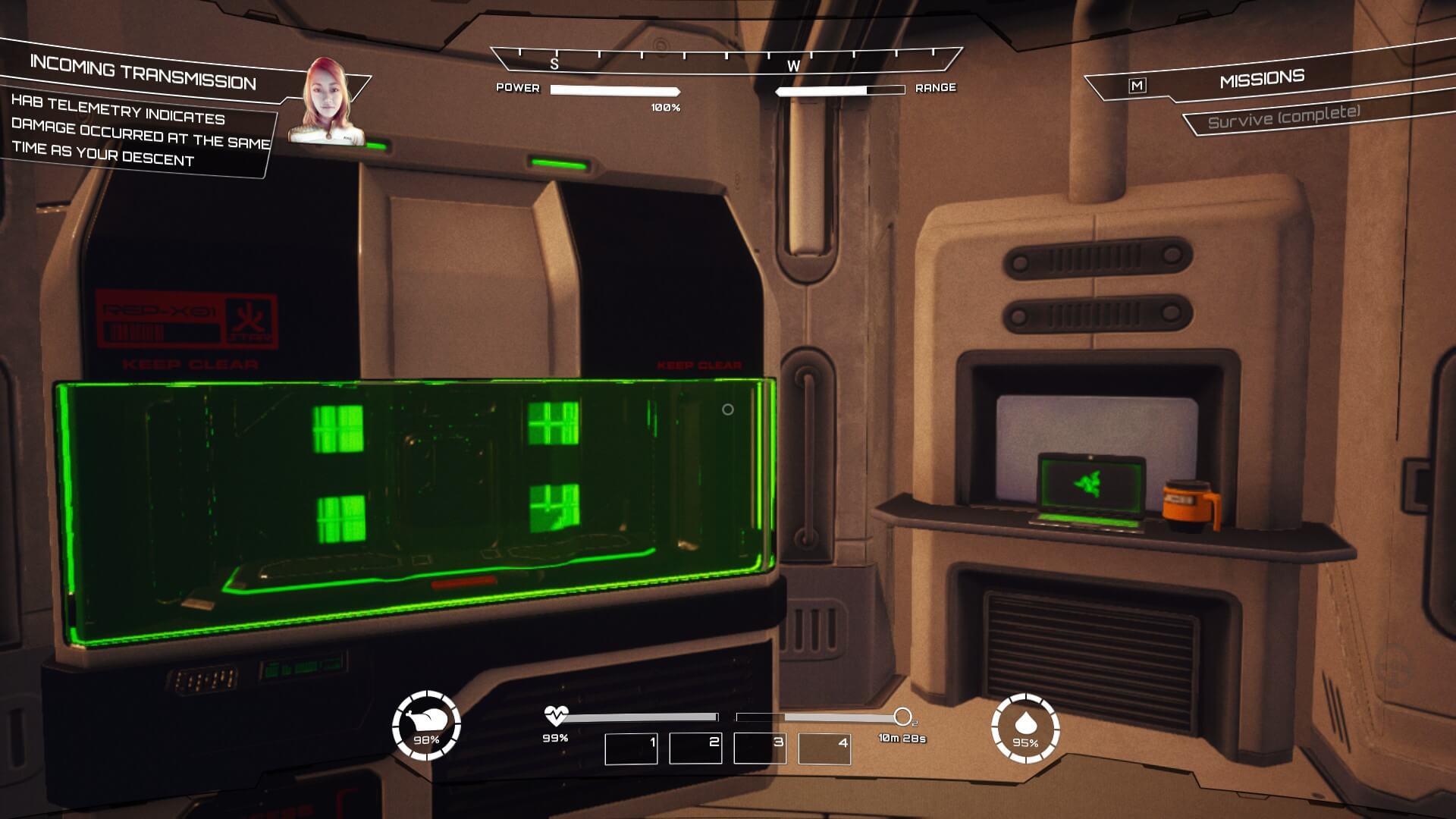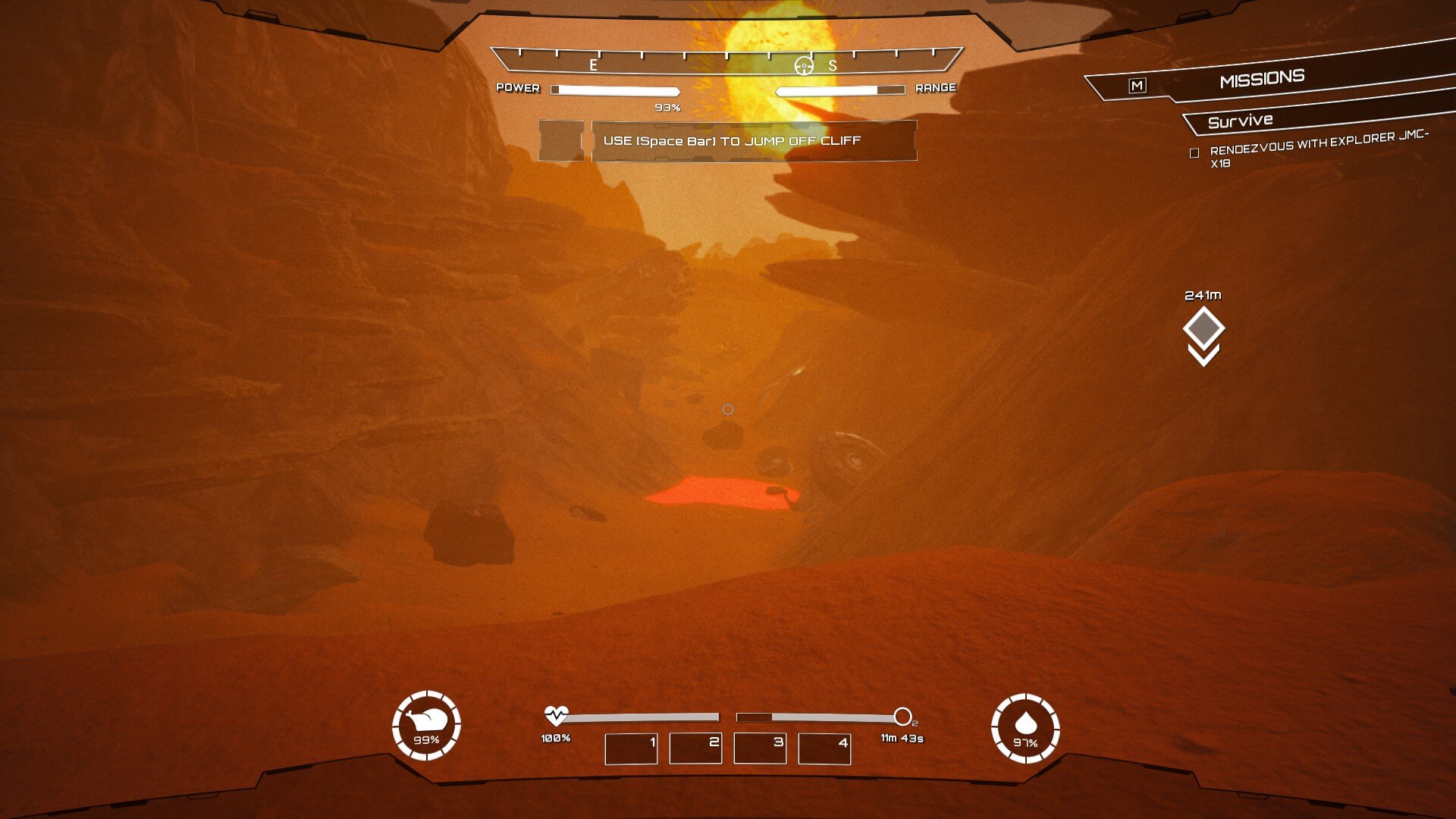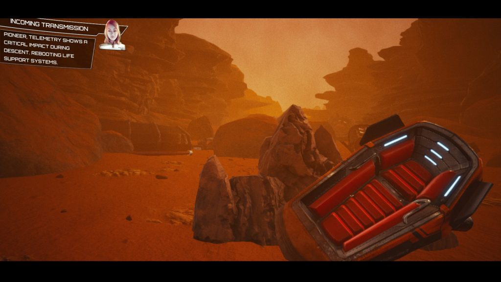In order to survive, you are going to have to manage your power, food, water, and (especially) oxygen. Of course, a simple landing on the planet would be too easy. Something caused you to have a “critical impact” with the surface. So, there you are, alone – except for some kind of female, mission control type of person, in the top left of the screen, aiding you with your (tutorial) journey. You are equipped with your spacesuit as a life source. Fortuitously, you do have a scanner. Upon its first use, the scanner pinpoints your first livable environment – the JMC X-18 Explorer, the futuristic equivalent of an advanced Martian rover. However, getting there is your first of a myriad of challenges.