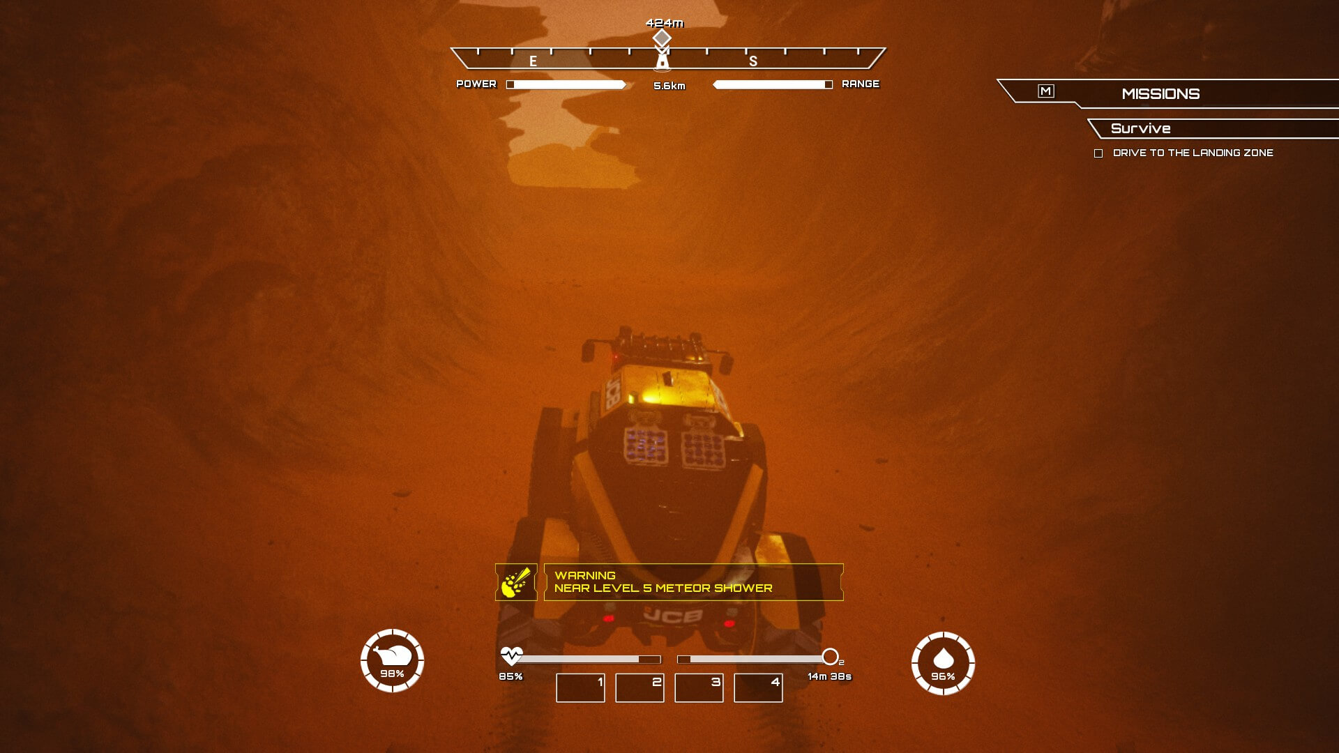 After you have avoided the meteor strikes, you will find yourself at the Explorer. Simply get in the vehicle and run another scan. This time, it will tell you where your livable habitat (now known as “hab”) is located. All you have to do then is drive to it. Easy enough? No, not quite. Now that you are ‘protected’ in a vehicle, JCB Pioneer: Mars throws pressure-based, electrostatic phenomenon (a.k.a. electromagnetic storms) at you – while you are driving. Your guide suggests that you take evasive maneuvers. (Gee, lady, ya think?)
