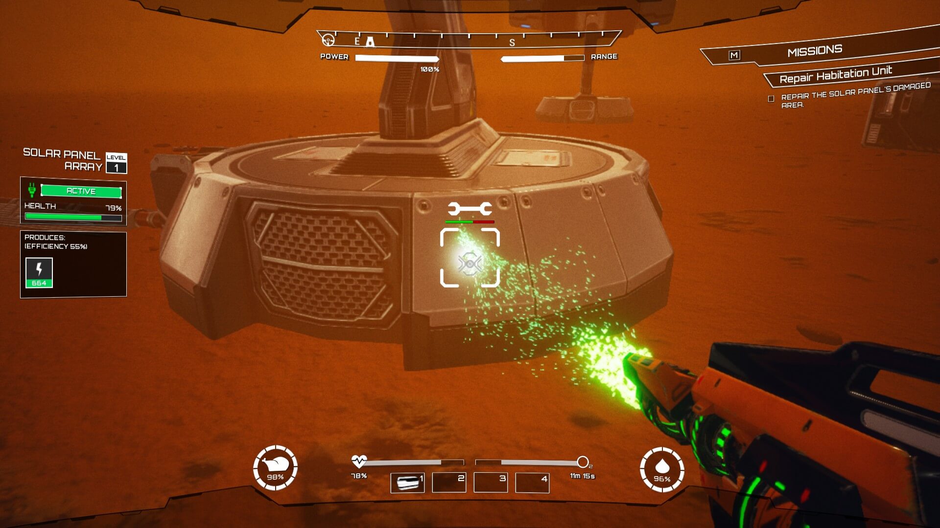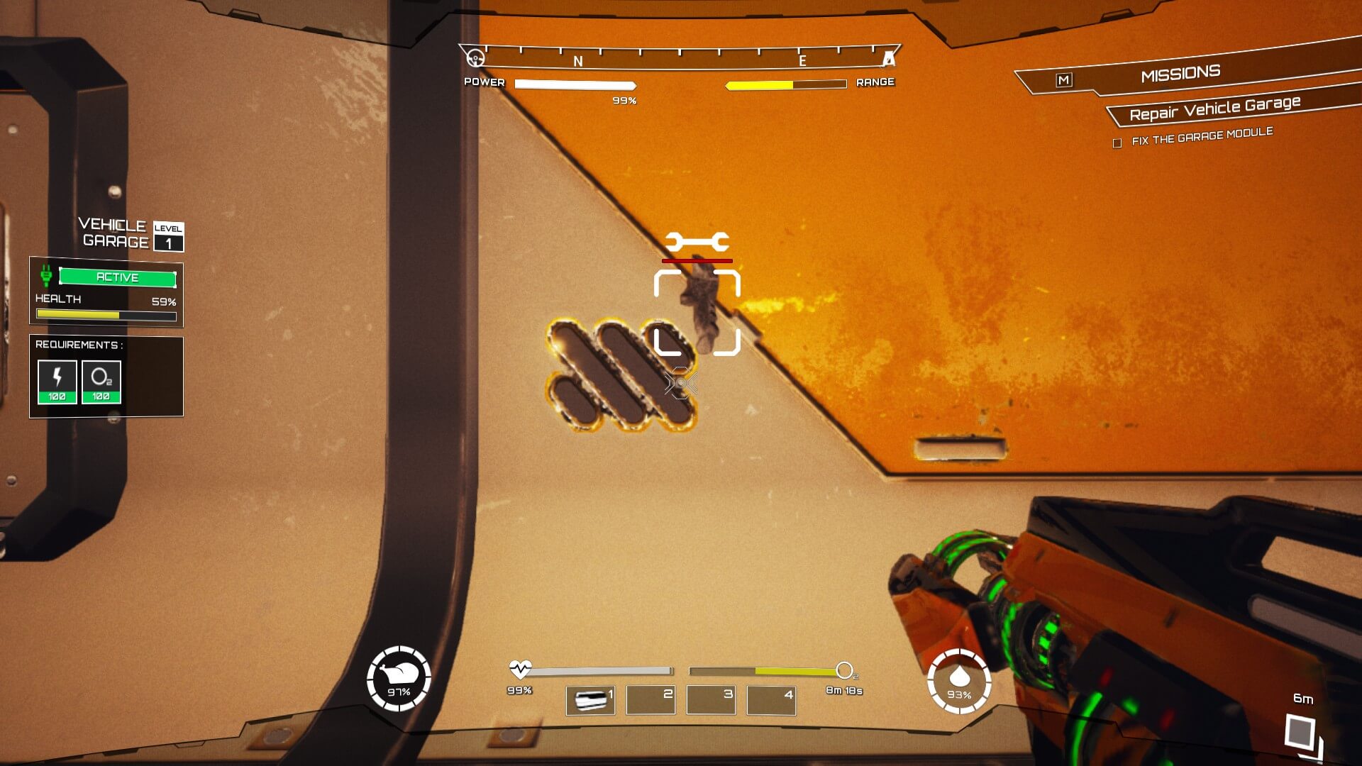 After getting away from two possible bouts with death, you finally make it to your hab. Once again though, it seems that while you were crashing into the surface, something was simultaneously damaging your hab. Hence, your next assignments: repairing the hab, its power supplies, and the garage that repairs your vehicle. This is when you get your first tool, for repairs. Without going into too much detail, fixing the solar panel (to get initial power to the hab) and the garage is relatively easy. Drive your JMC X-18 into the garage and it too is mended and ready.