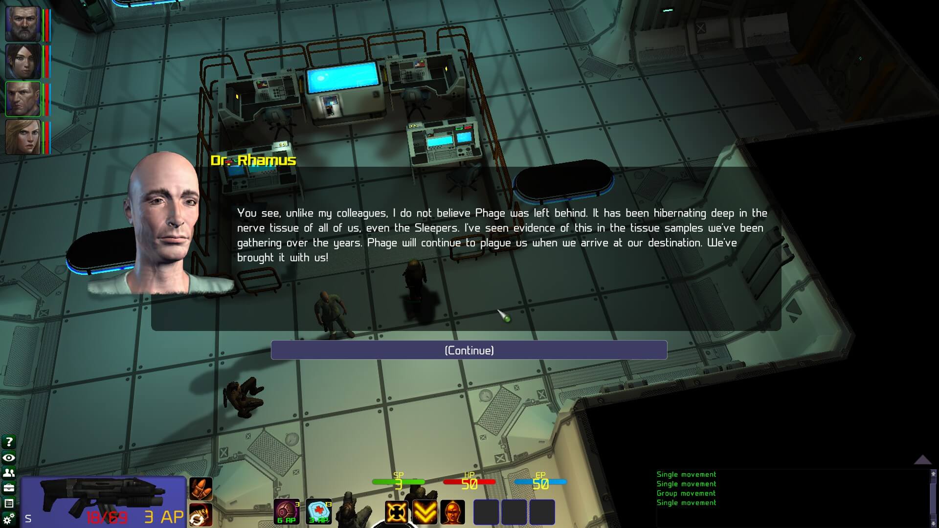 Stellar Tactics is an exciting, in-devopment space RPG that starts you out on one of only a few large ships that are transporting the last of humanity. Each ship, including your own, carries about a quarter of a million people. Unlike most of the rest of hibernating humans, you and your three teammates are awake and tasked to, basically, save Humanity. A few individuals are awake and roaming the ship as well though. However, most of them have been infected with the near-world-ending disease of the Phage. The Phage has turned them into, as much as I dislike the term, zombies. [No need to worry, they are only around long enough to teach you how to die—I mean, learn how to play].