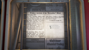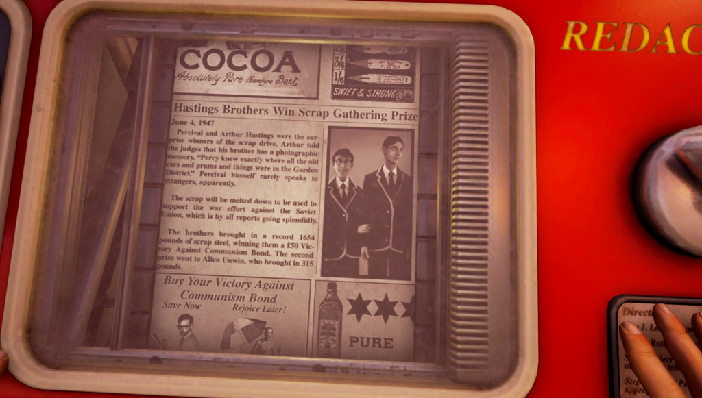 The thing with a world where forgetfulness is king, especially one with a really intriguing alternate reality setting, it doesn’t actually give up much in the way of information on it’s own history. That’s likely just where I’ve only penetrated three of the settings deep into Arthur’s story, but then the fault also might be with the very same Mr Hastings; whose job in redacting newspapers gives us brief windows into history, the nature of his job, but also no context for the stories we are seeing. Returning to my recordings of my first play through the game where I had fully explored the prologue section of the game, I noticed that the first newspaper article approved during the gameplay is an article from 1945 telling of a garden show winner stealing the show with a depiction of the Nazi flag alongside Britain’s Jack; telling that the two were one nation, or at least heavily allied. Other clippings, especially the adverts in the paper tell of the united fight back against the USSR; specifically when the protagonists memories are jostled by an image of his brother from when they won a scrap search through the ruined districts to help in the fight against the red menace – he is shaken by the sounds of a train leaving a station, and the brothers shouting to each other. There’s no doubt more story to be told through characters yet to be added, and through the other two playable characters set to join Arthur in the full release – after-all, Wellington’s drug addiction comes from a want to forget the atrocities that the island-city committed in order to remain intact while Britain was laid to waste by the Nazi occupying forces in 1933 [from the game’s Kickstarter page].