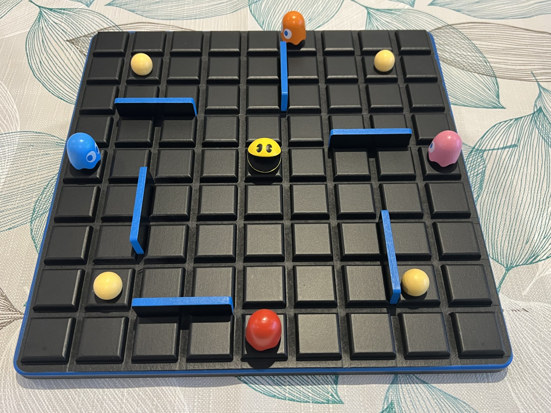 Now enter the variant: Quoridor Pac-Man. Here, the grid becomes a (relatively basic) maze, and the pawns are replaced with Pac-Man and the four ghosts — Blinky, Pinky, Inky, and Clyde. One player controls Pac-Man, who starts in the centre and must collect four power pellets placed in the corners. The other players control the ghosts, starting from the edges and trying to catch Pac-Man before he completes his objective.